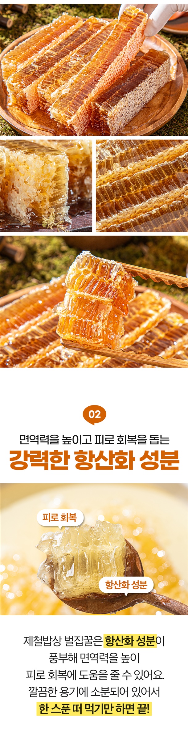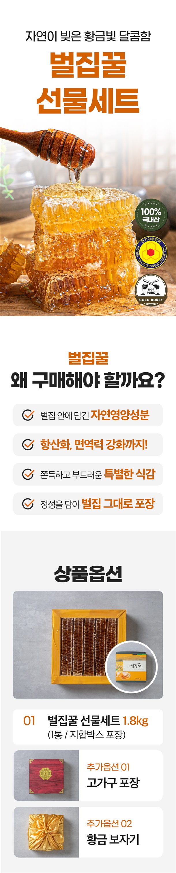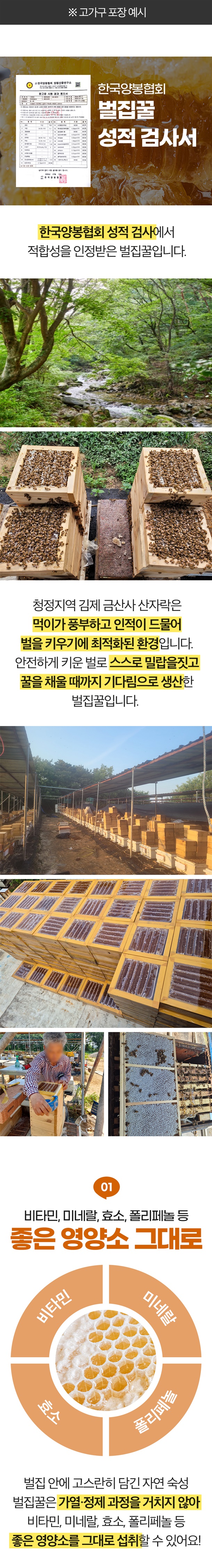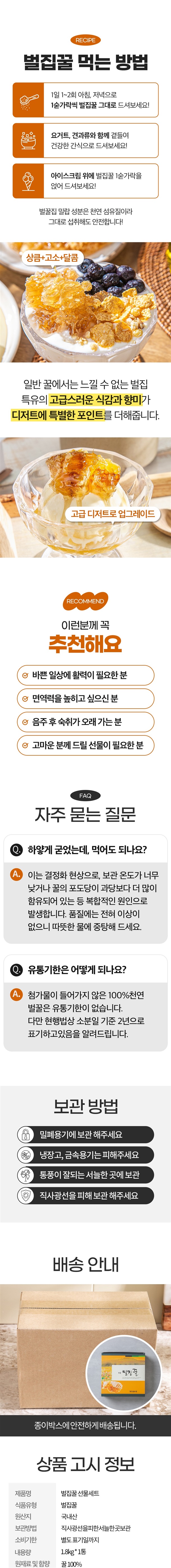 | 4. 제조연월일(포장일 또는 생산연도), 유통기한 또는 품질유지기한 | 첨가물이 들어있지 않은 100% 천연꿀은 유통기한이 없습니다. 다만 현행법상 소분일 기준 2년으로 별도 표기하고 있습니다. |