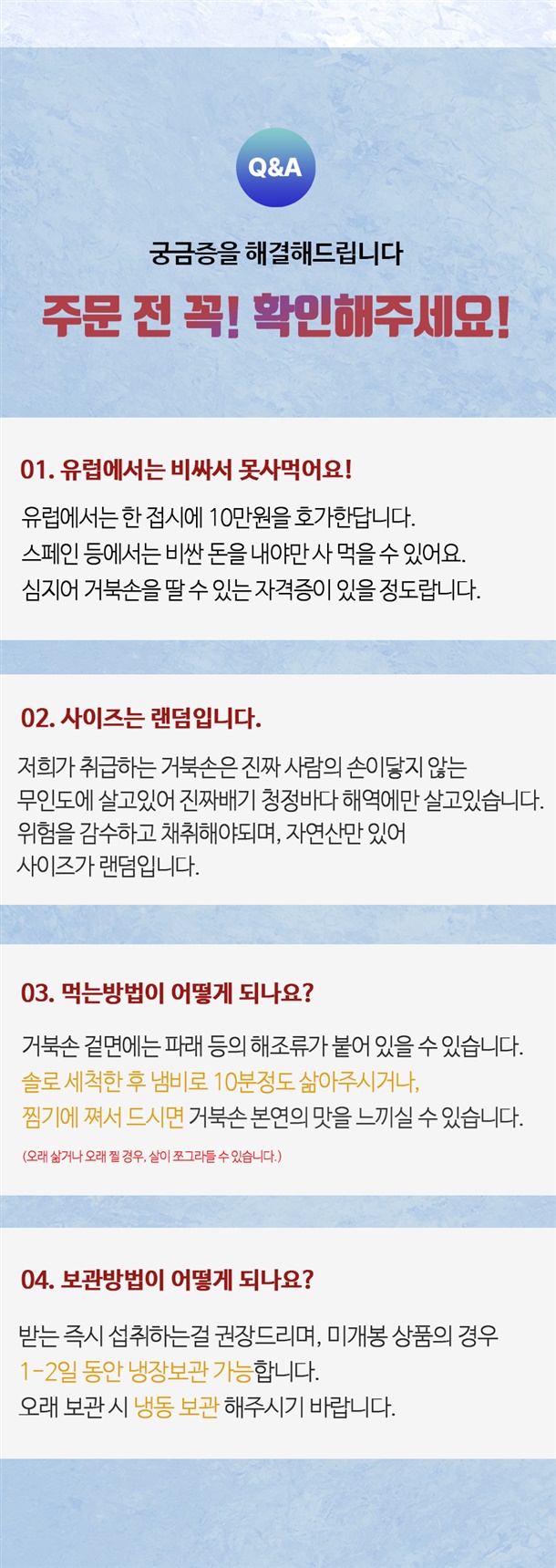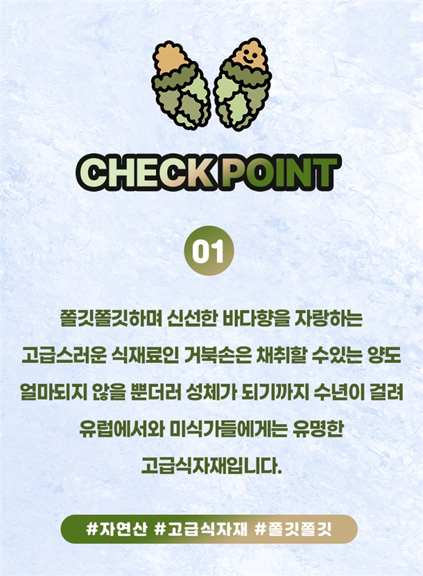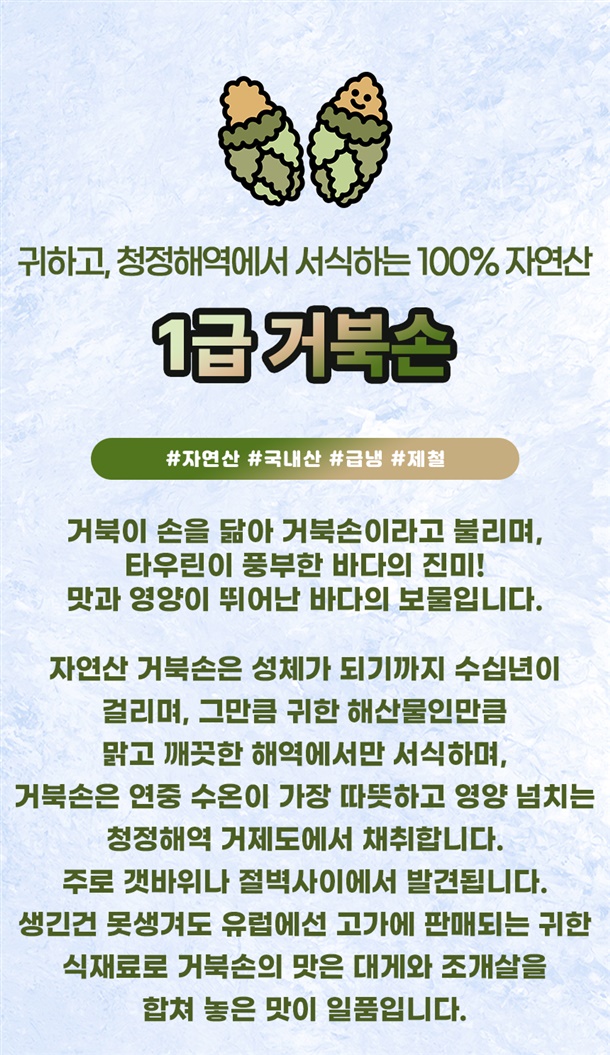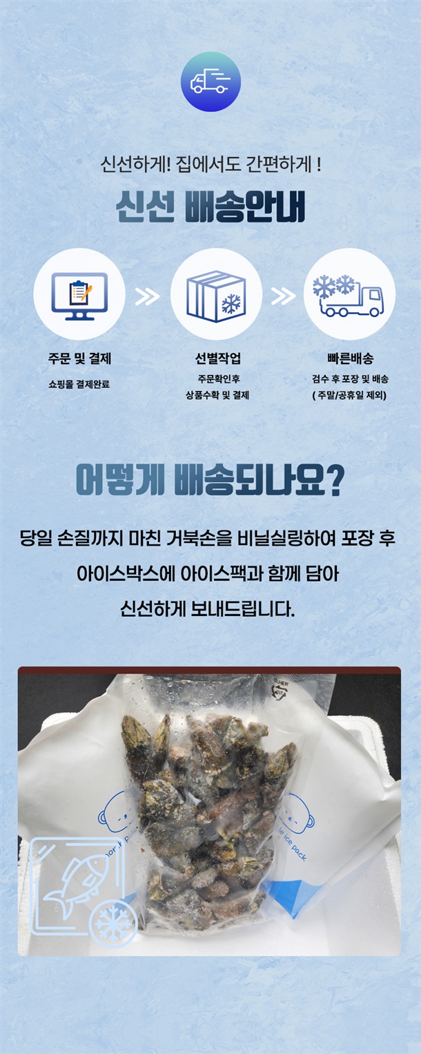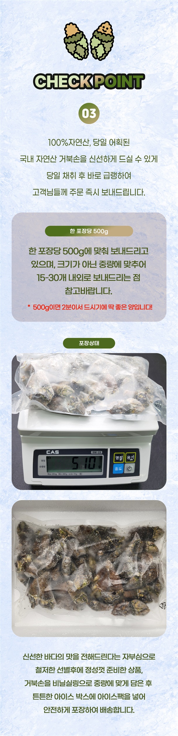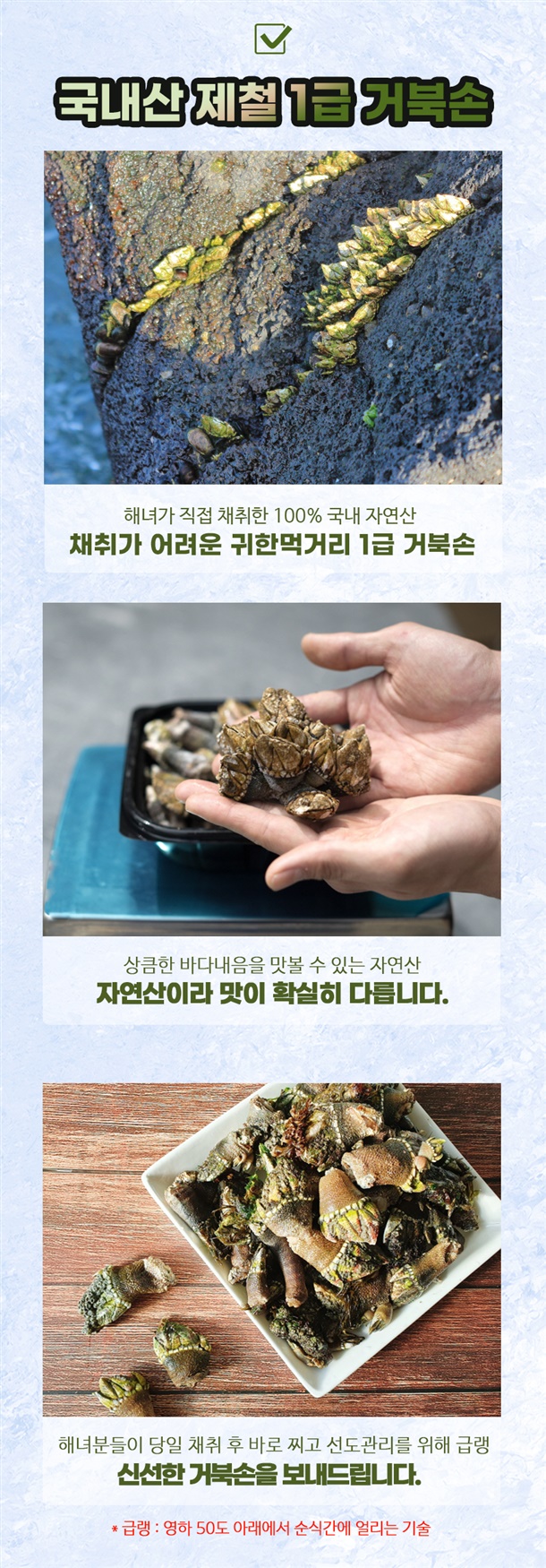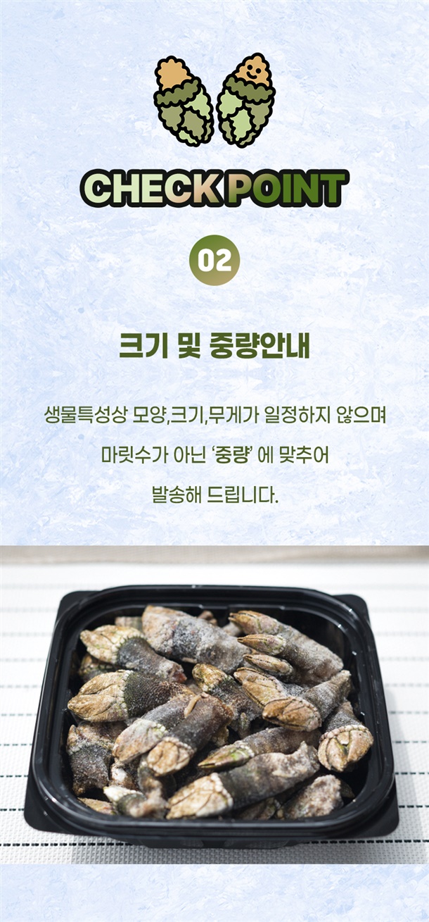 | 1. 포장단위별 용량(중량), 수량, 크기 | 급냉 거북손 / 500g / 1팩 |