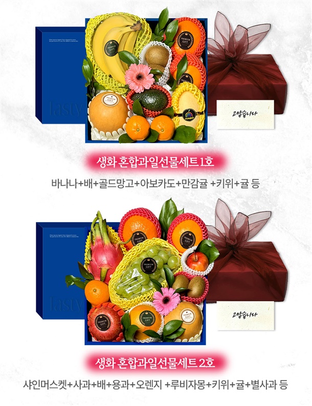 | 1. 포장단위별 용량(중량), 수량, 크기 | 실속 2호 과일 선물 세트(배6과), 실속 3호 과일 선물 세트(사과6과), 일품 D 과일 선물 세트(사과2과+배4과), 생화 혼합 과일 선물 세트 1호(바나나+배+골드망고+아보카도+만감귤+키위+귤 등(총7~9종 제철과일 갯수 랜덤)), 생화 혼합 과일 선물 세트 2호(샤인머스켓+사과+배+용과+오렌지+루비자몽+키위+귤+별사과 등 (총7~9종 제철과일 갯수 랜덤)) |