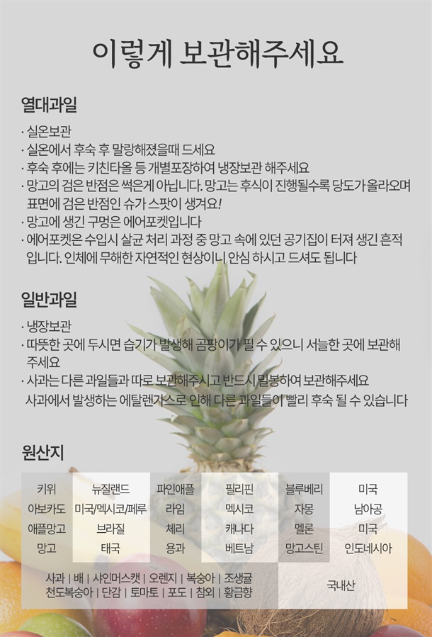 | 3. 농수산물의 원산지 표시에 관한 법률에 따른 원산지 | 사과/배/샤인머스케/오렌지/복숭아/조생귤/천도복숭아/단감/토마토/포도/참외/황금향(국내산),키위(뉴질랜드),파일애플(필리핀),블루베리(미국),아보카도(미국/멕시코/페루),라임(멕시코),자몽(남아공),애플망고(브라질),체리(캐나다),멜론(미국),망고(태국),용과(베트남),망고스틴(인도네시아) |