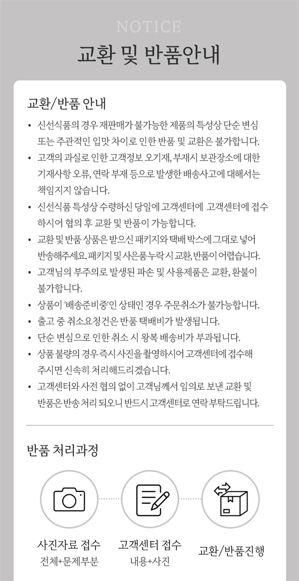 2. 고객센터와 사전협의 없이 고객님께서 임의로 보낸 교환 및 반품은 반송처리 되오니 반드시 고객센터 또는 카카오채널로 먼저 연락 부탁드립니다.