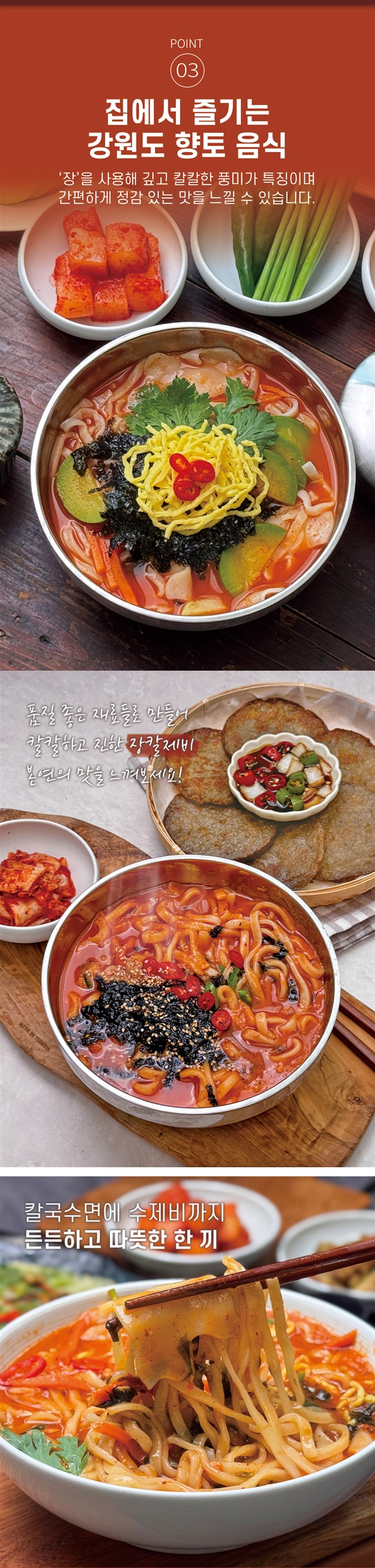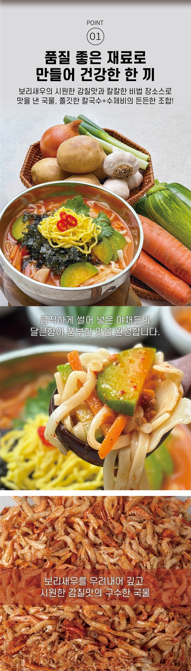 | 5. 원재료 및 함량 | 밀가루(호주산)55%, 장칼국수양념장34%[고추장5%, 고춧가루(중국산)3%, 정제소금3%, 대파2%, 보리새우(태국산)2%, 복합조미식품2%, 마늘1%, L-글루탐산나트륨1%], 당근, 감자, 호박, 건표고버섯(중국산), 혼합야채-C, 구운참김가루(국내산), 참깨분말(인도산) |