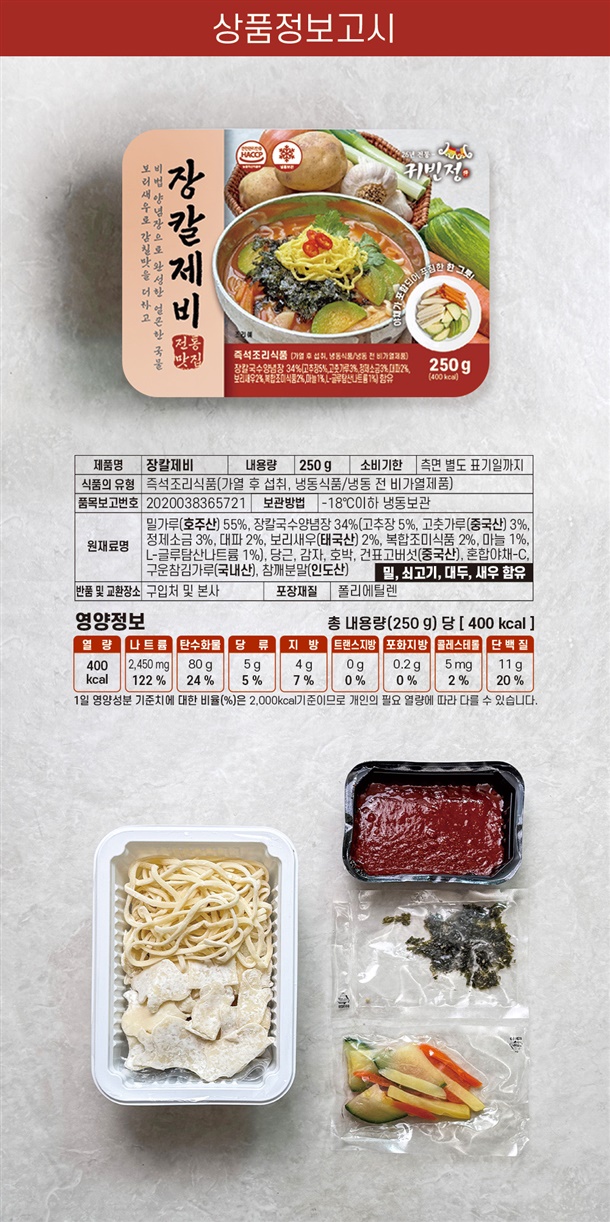 | 1. 포장단위별 용량(중량), 수량, 크기 | 장칼국수 수제비 250g / 1세트 |