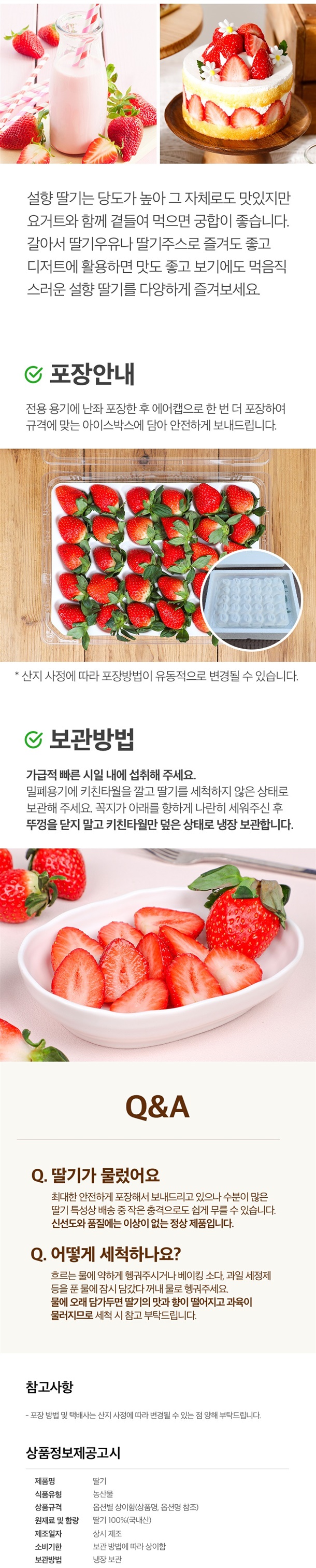 | 1. 포장단위별 용량(중량), 수량, 크기 | 설향 딸기 750g / 20-30구 |
