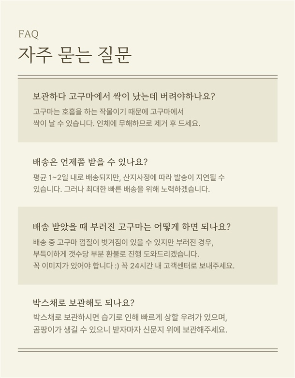 1. 배송은 입금확인된 날짜로부터 1~3일 소요되며 최대 7일 이내 출고됩니다. (공휴일, 기상악화 등 불가피한 상황에 따라 추가 지연될 수 있습니다.)