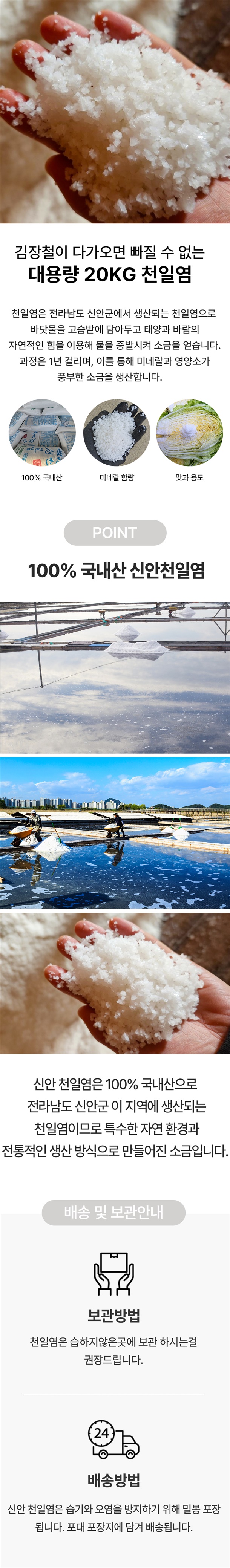 1. 포장단위별 용량(중량), 수량, 크기 | 신안 천일염 20kg 1포대 |