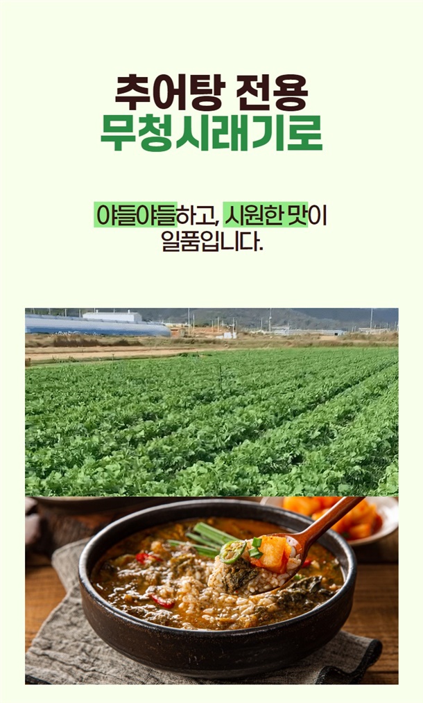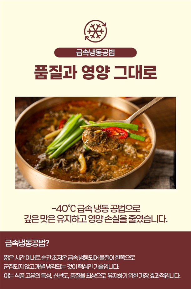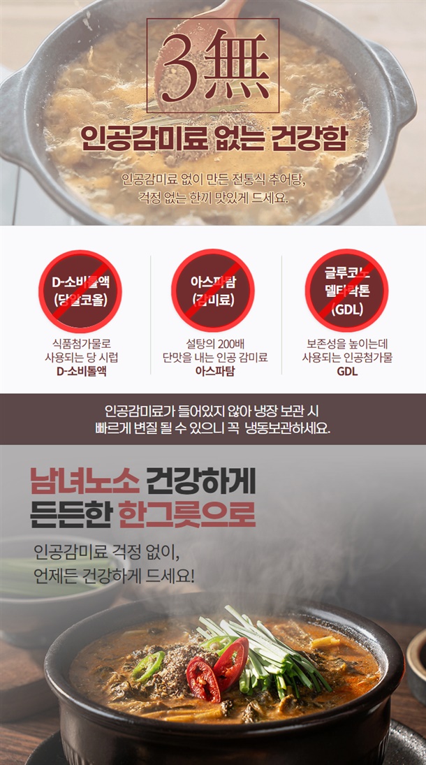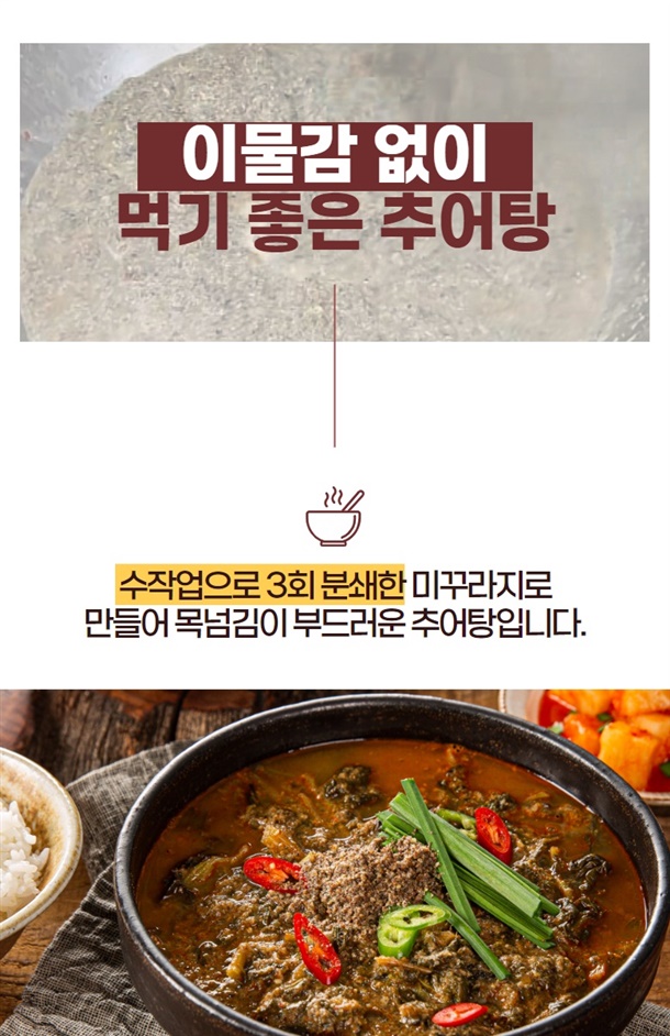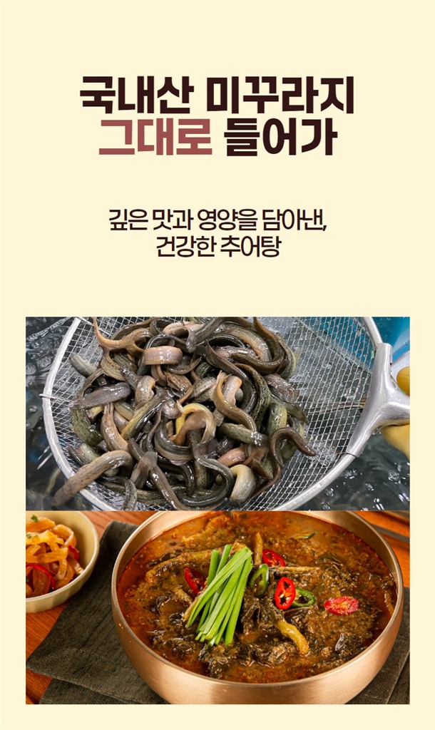 | 1. 포장단위별 용량(중량), 수량, 크기 | 추어탕 1팩 / 500g,얼큰 추어탕 1팩 / 500g |