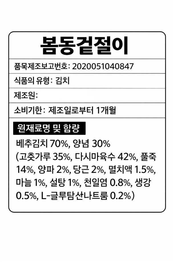 | 1. 포장단위별 용량(중량), 수량, 크기 | 봄동겉절이 1kg |