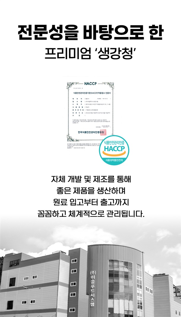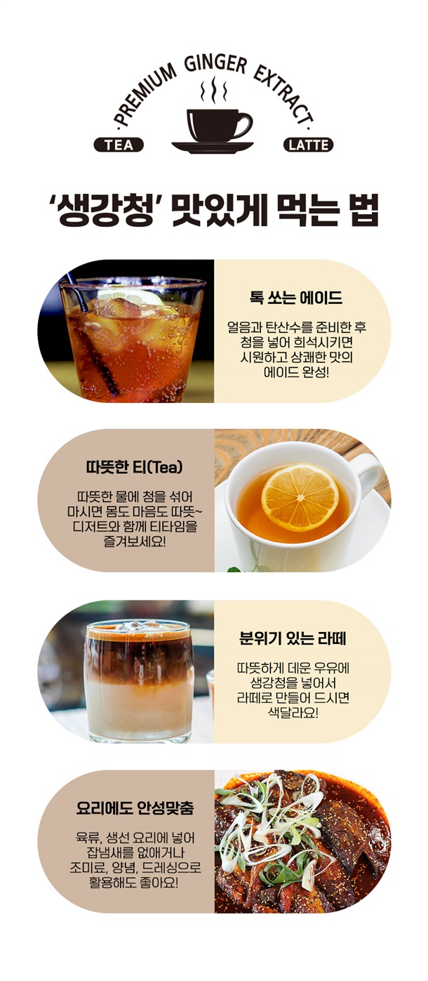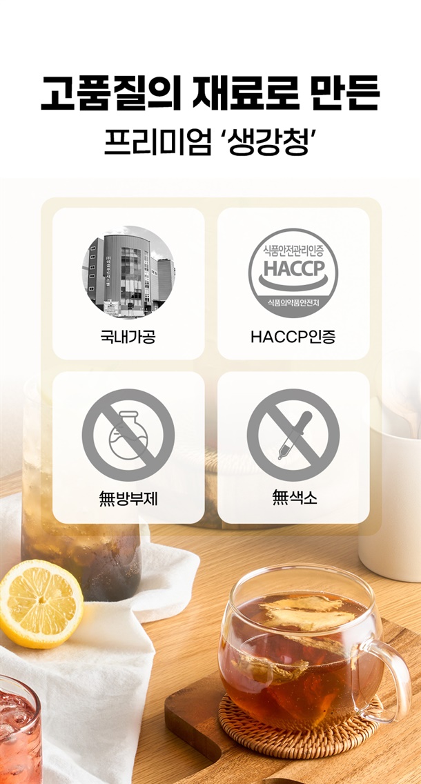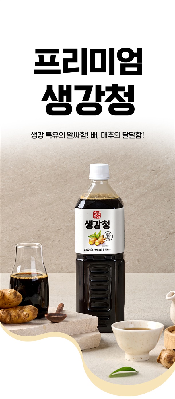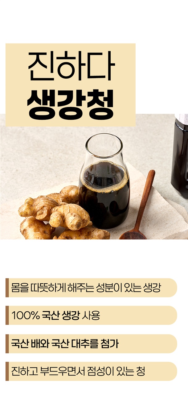 | 5. 원재료 및 함량 | 생강농축액EM 69%[흑설탕, 당류가공품{결정과당, 생강추출액 28%(생강:국산)}], 정제수, 과채가공품1[대추(국산)], 과채가공품2[배(국산)], 올레오레진진저0.2%, 폴리소르베이트80 |