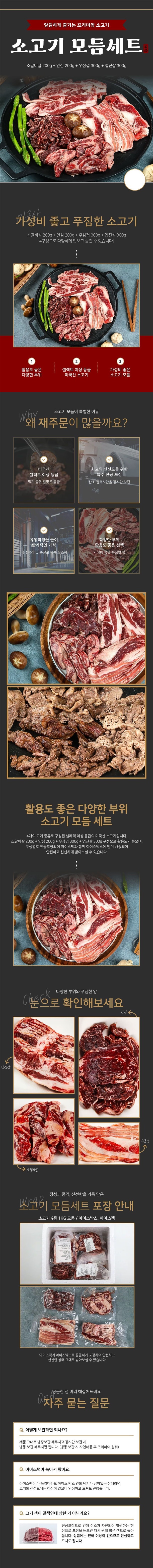 | 1. 포장단위별 용량(중량), 수량, 크기 | 소고기 4종 1KG 모둠 / 소갈비살 200g + 안심 200g + 우삼겹 300g + 업진살 300g |