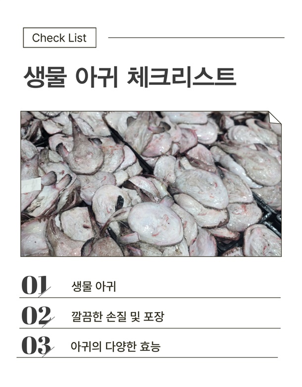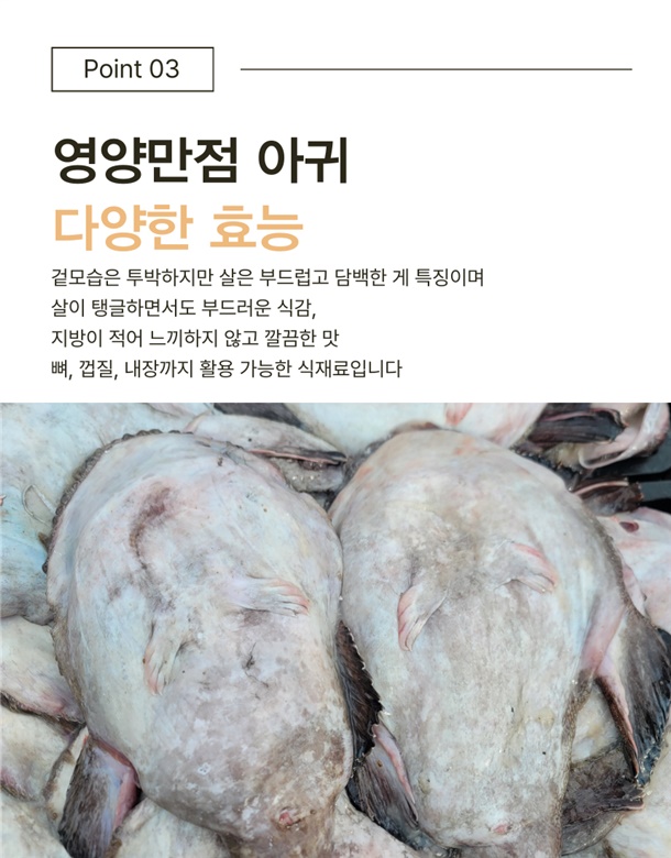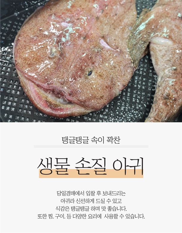 | 1. 포장단위별 용량(중량), 수량, 크기 | 생물 손질아귀 1미 / 대짜 손질전2kg내외 |