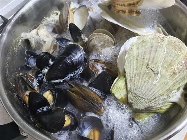 1. 찜기에 물을 넉넉하게 넣고 깨끗하게 씻은 조개를 올려 주세요.