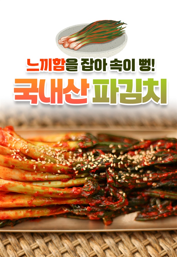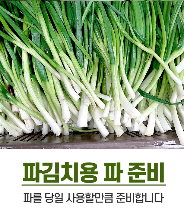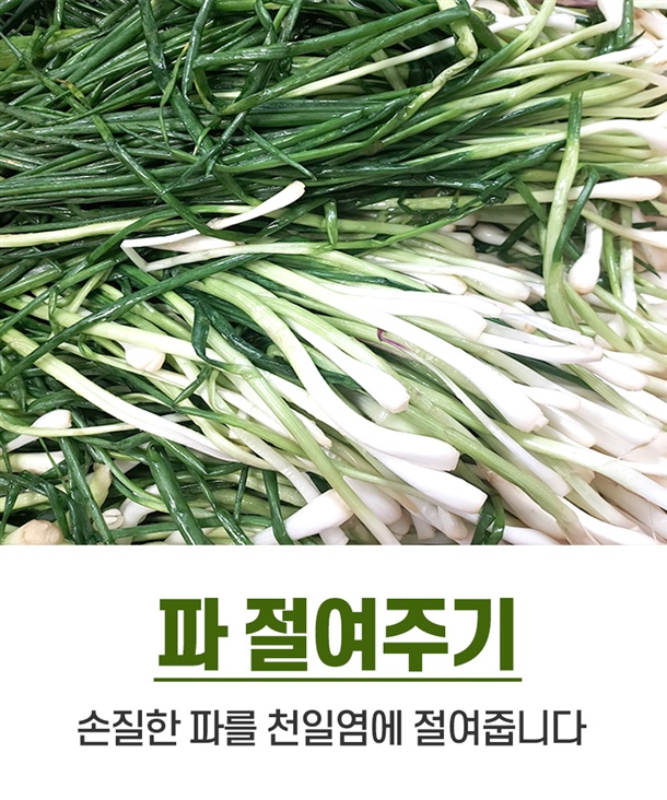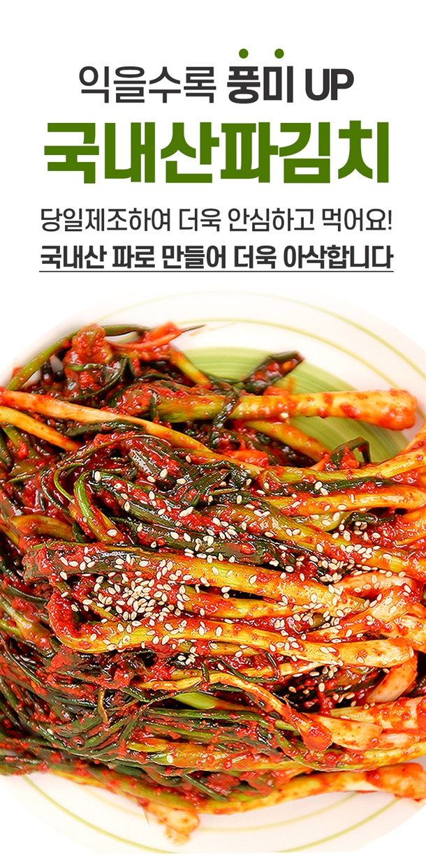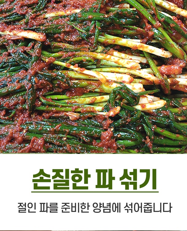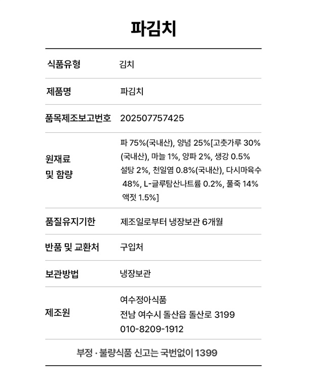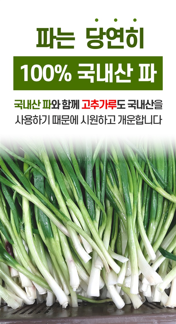 | 5. 원재료 및 함량 | 파 75%(국내산), 양념 25%[고춧가루 30% (국내산), 마늘 1%, 양파 2%, 생강 0.5% 설탕 2%, 천일염 0.8%(국내산), 다시마육수 48%, L-글루탐산나트륨 0.2%, 풀죽 14% 액젓 1.5%] |