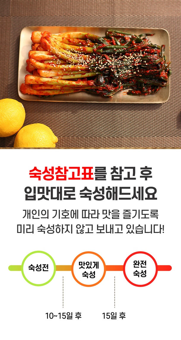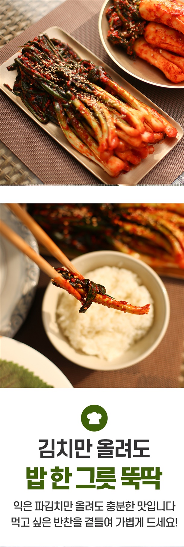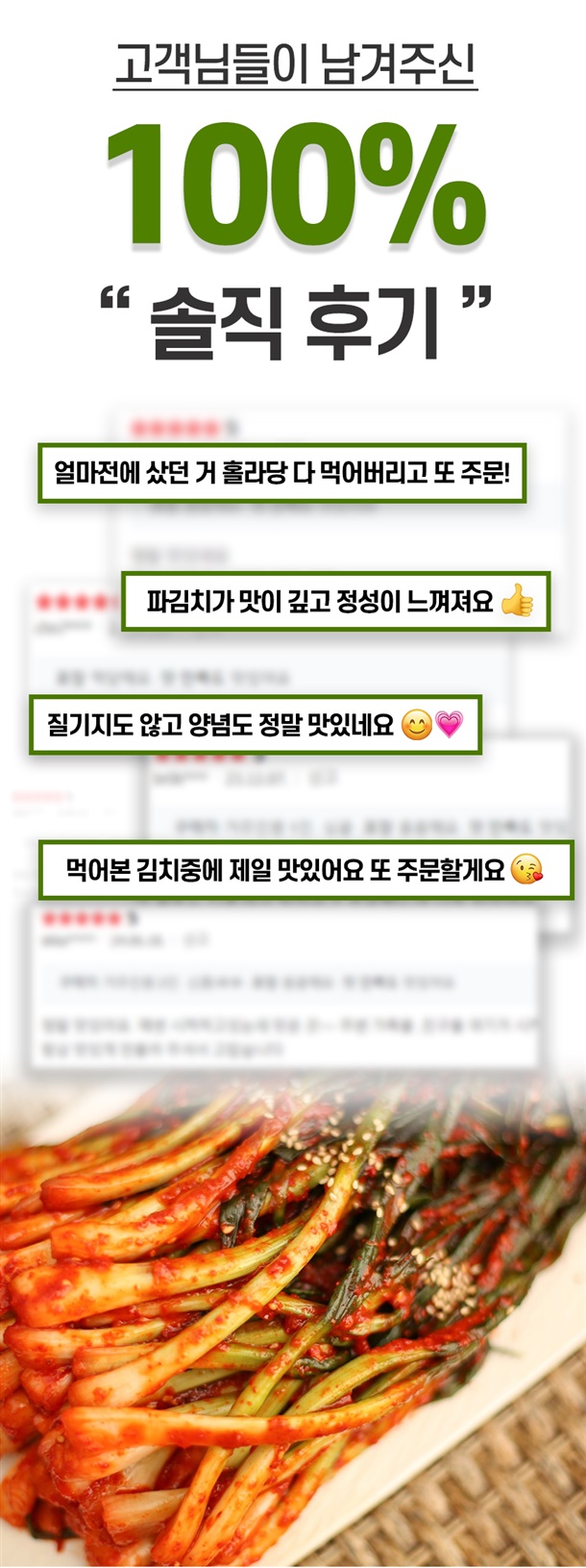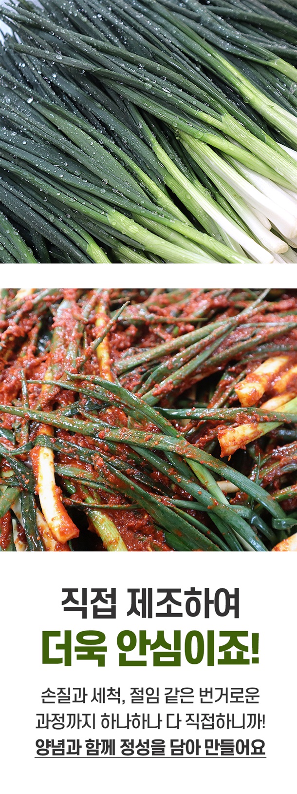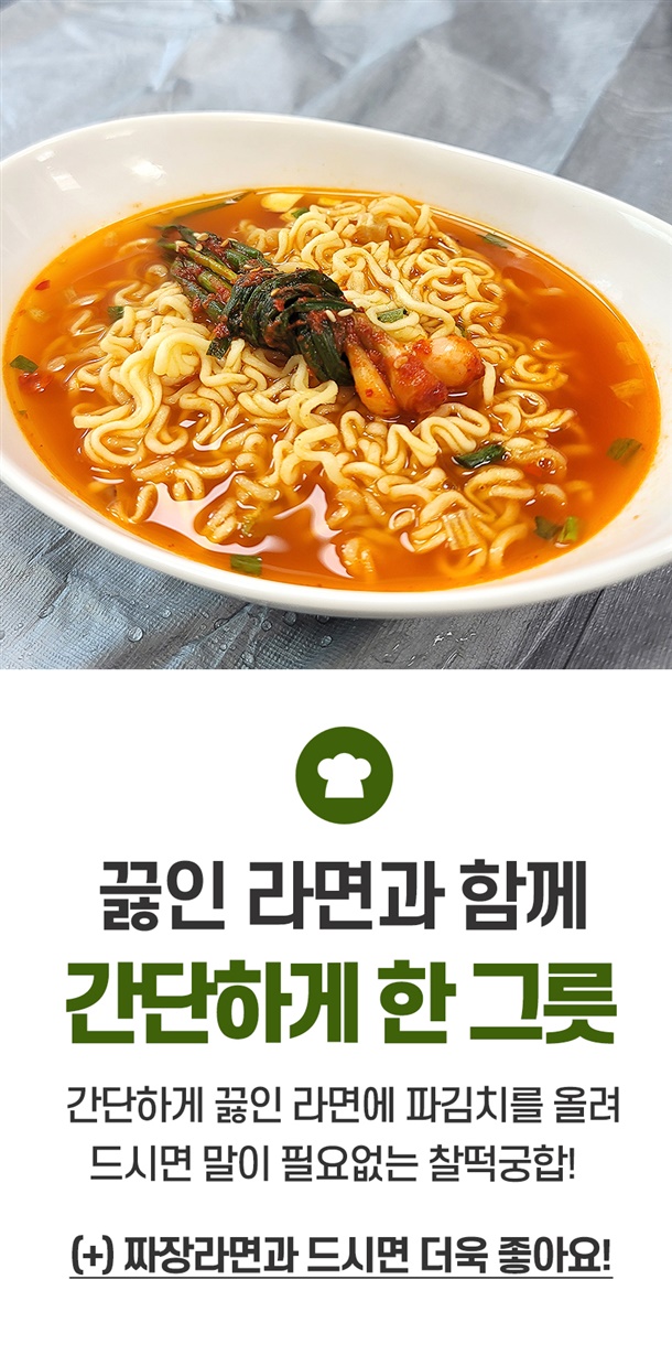| 5. 원재료 및 함량 | 파 75%(국내산), 양념 25%[고춧가루 30% (국내산), 마늘 1%, 양파 2%, 생강 0.5% 설탕 2%, 천일염 0.8%(국내산), 다시마육수 48%, L-글루탐산나트륨 0.2%, 풀죽 14% 액젓 1.5%] |
