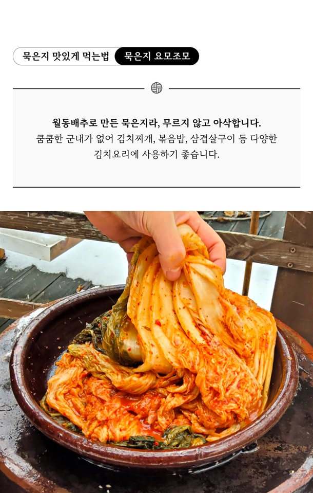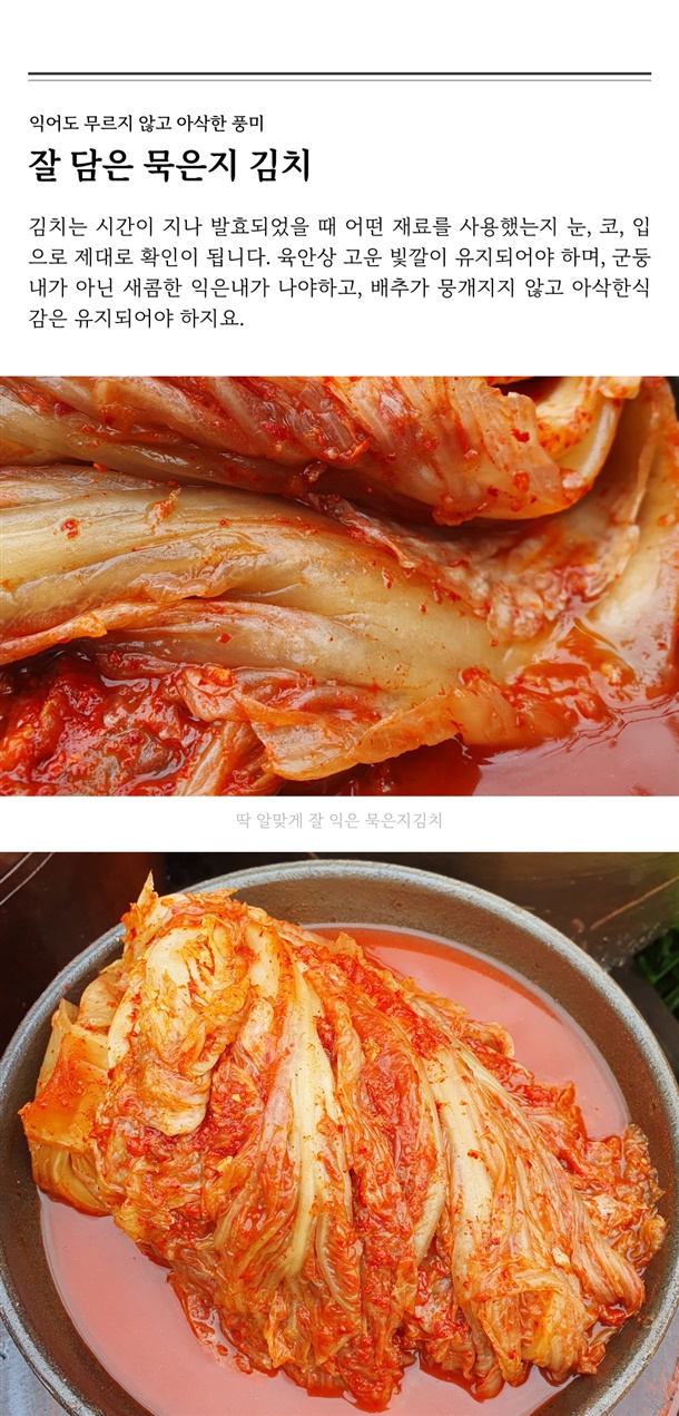 | 4. 제조연월일(포장일 또는 생산연도), 유통기한 또는 품질유지기한 | 묵은지 : 제조일로부터 180일 |