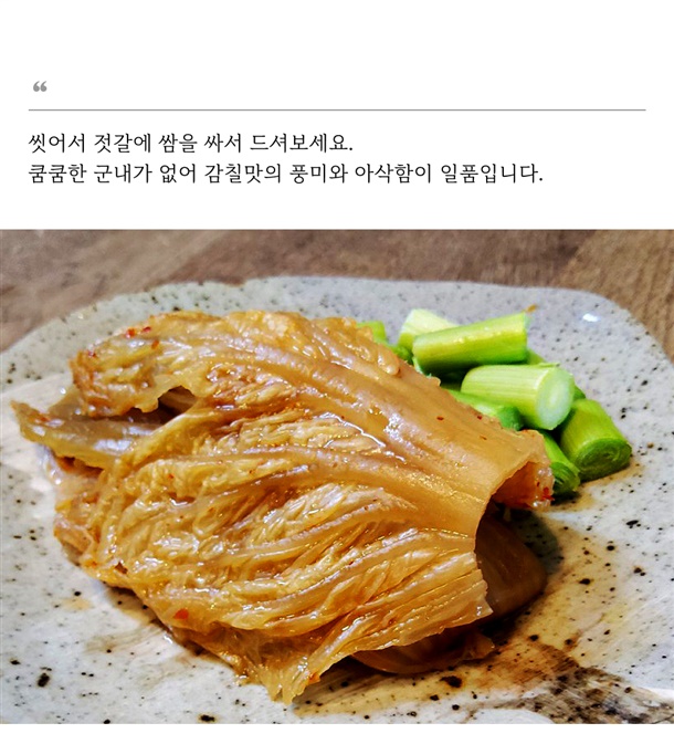 | 5. 원재료 및 함량 | 묵은지 : 절임배추[배추(국산)98%,식염(국산)2%]77.16%,정제수,무(국산)7.1%,고춧가루(국산)2.3%,마늘(국산)2.2%,양파(국산)0.9%,액젓,생강,식염,치자분말,L-글루탐산나트륨,사카린나트륨제제,매실엑기스,소주 |