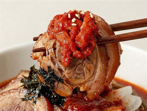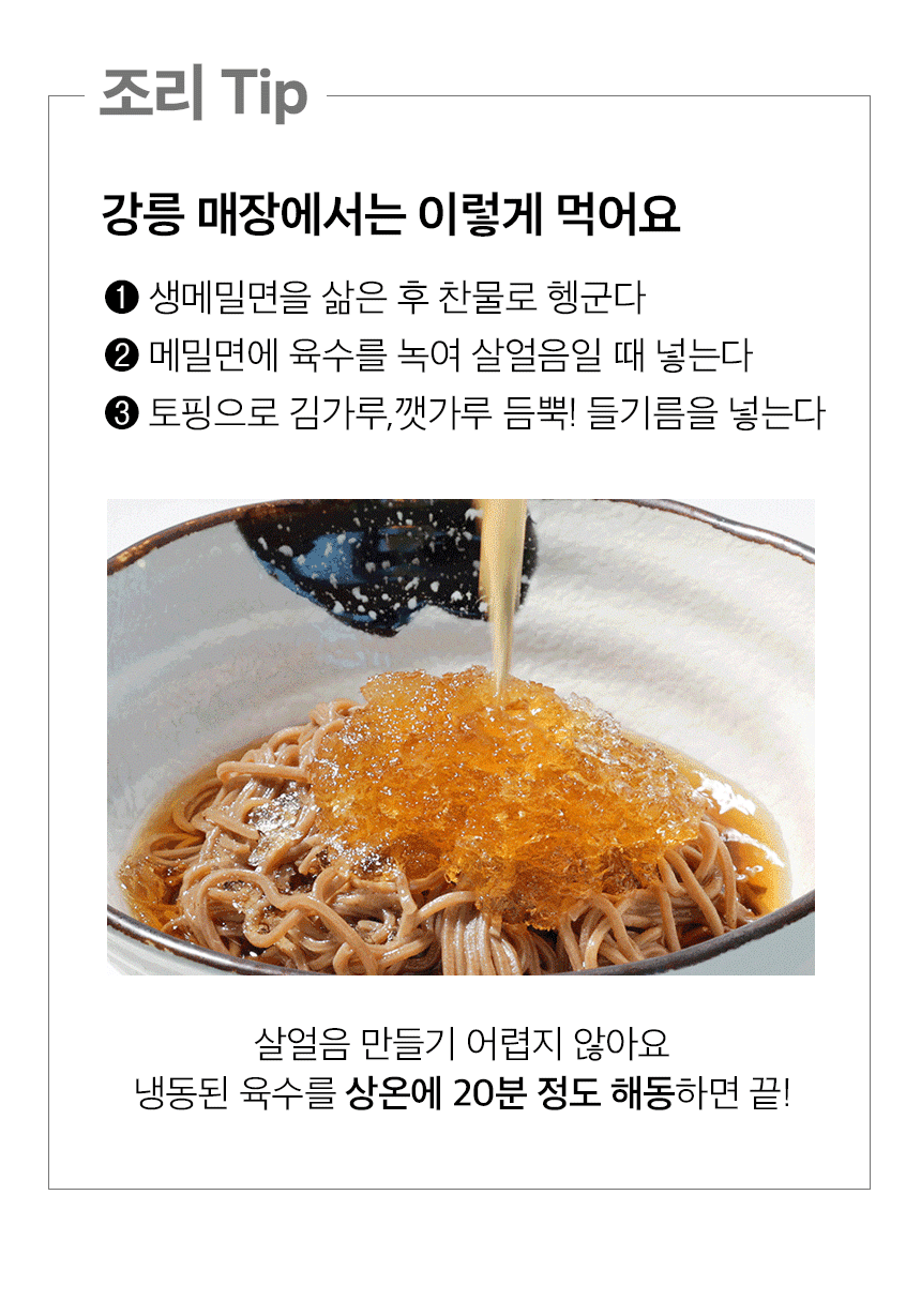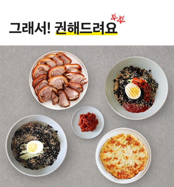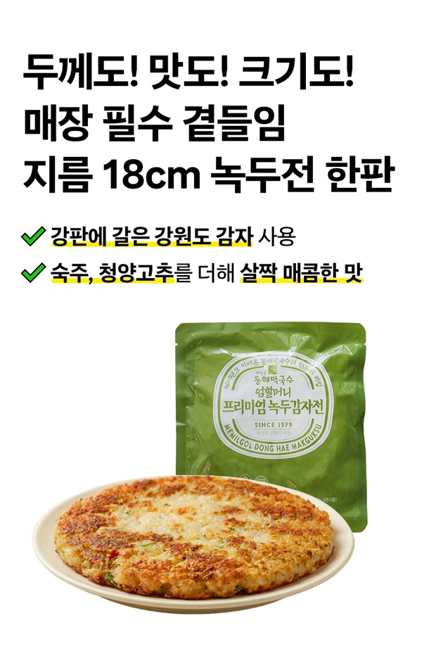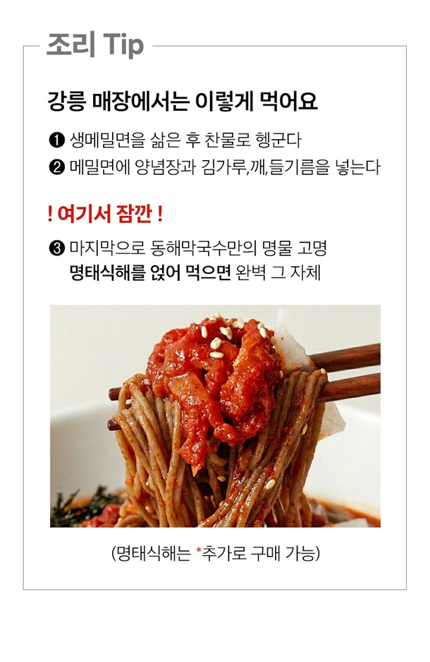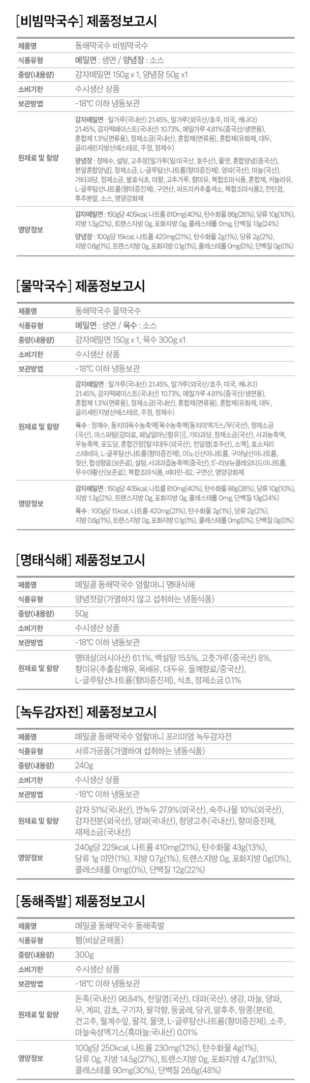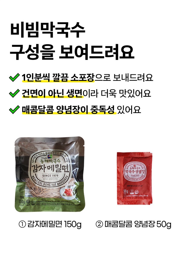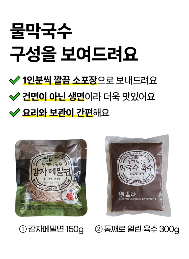 | 1. 포장단위별 용량(중량), 수량, 크기 | 비빔막국수 3팩/물막국수3팩/비빔막국수6팩/물막국수6팩/명태식해6팩/녹두감자전2팩/순살족발1팩 |
