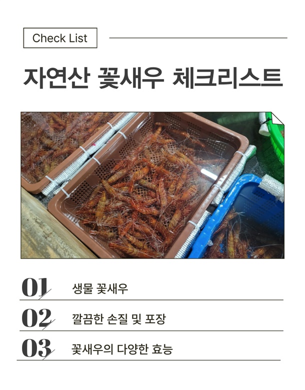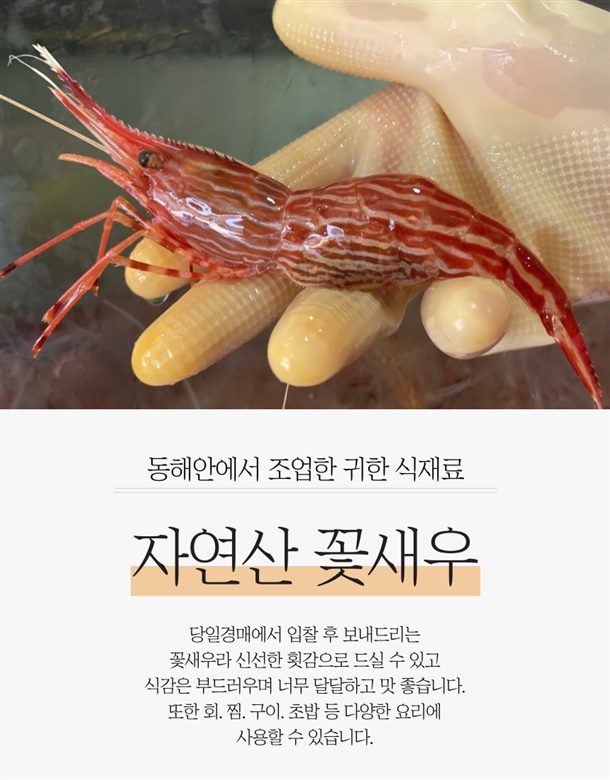 | 1. 포장단위별 용량(중량), 수량, 크기 | 활 꽃새우 500g 24미내외/ 활 닭새우 500g 24미내외 |