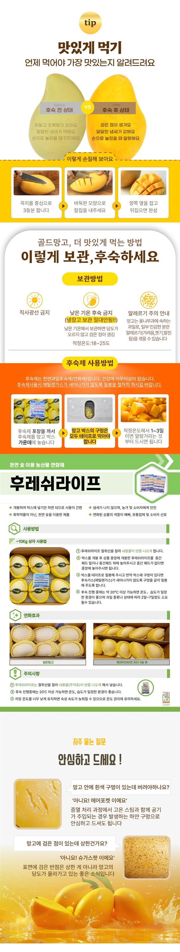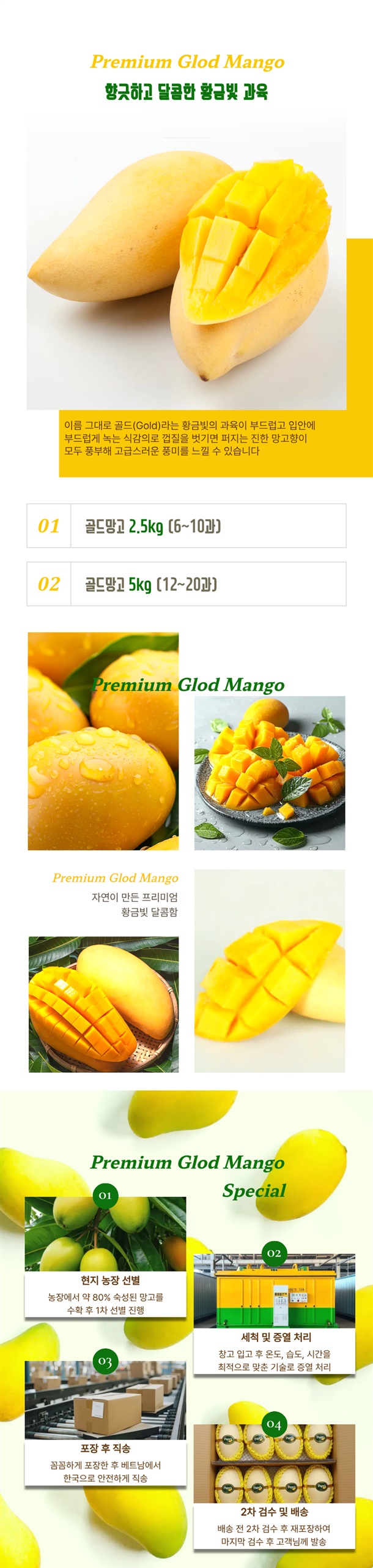 | 1. 포장단위별 용량(중량), 수량, 크기 | 골드망고 2.5kg(6-10과)/ 골드망고 5kg(12-20과) |