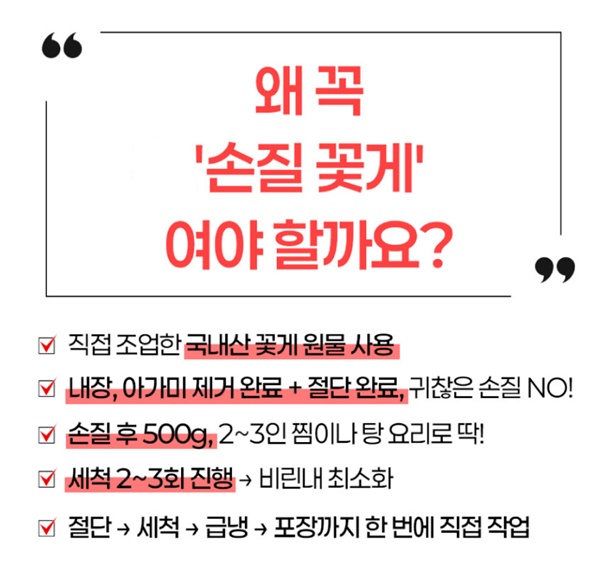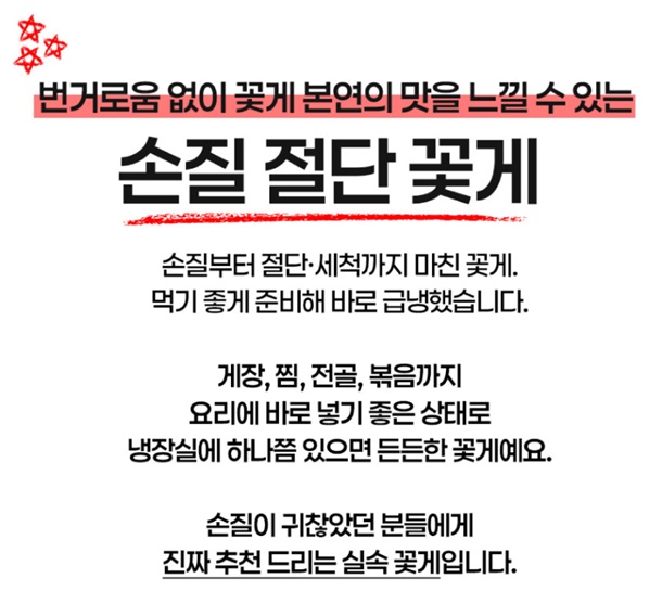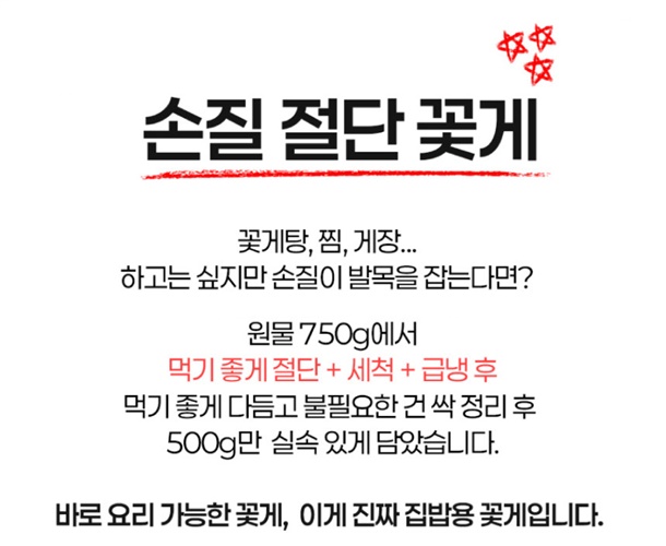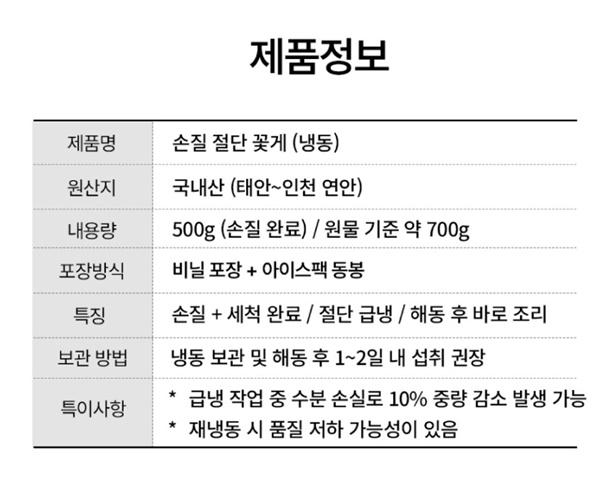 | 1. 포장단위별 용량(중량), 수량, 크기 | 통통한 손질 꽃게 500g |