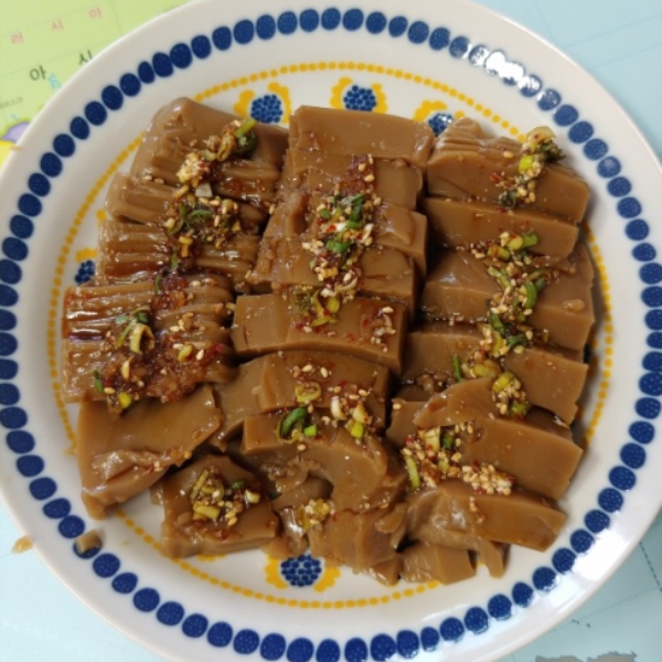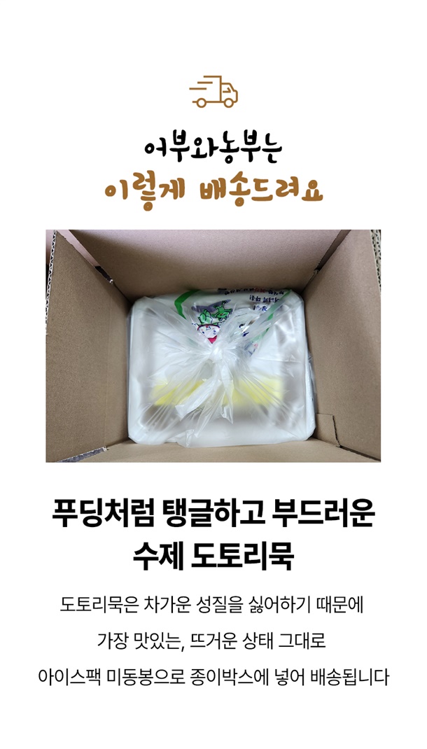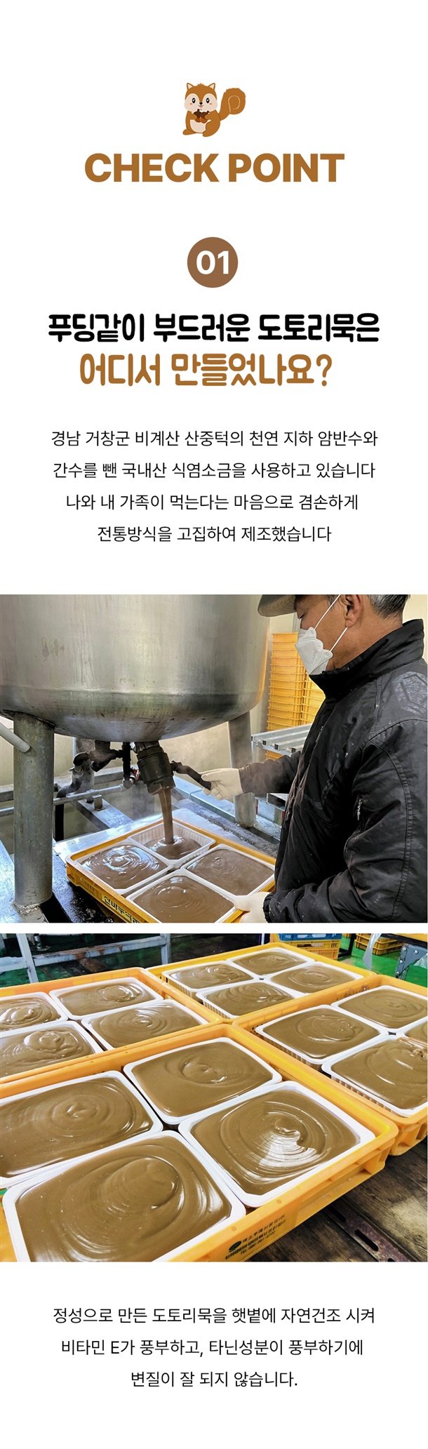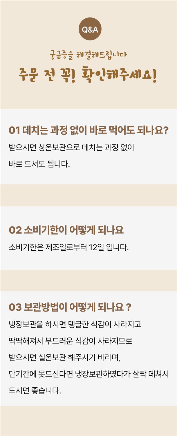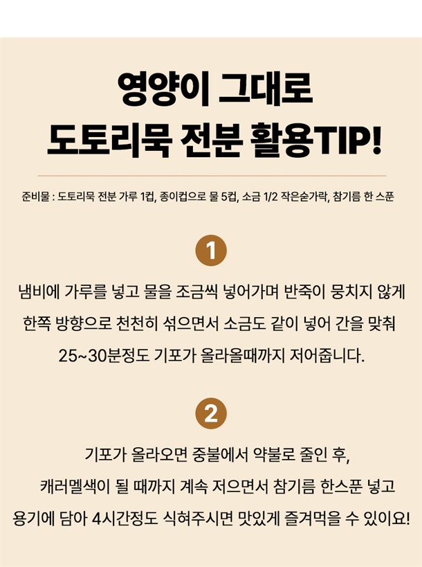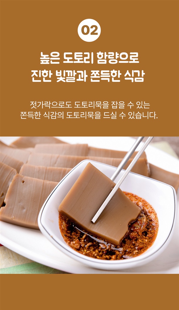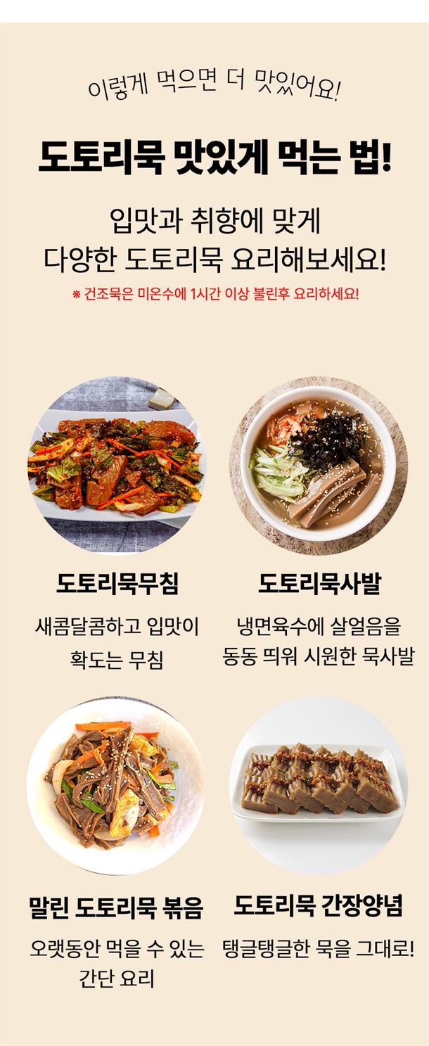 7. 특이사항 | 냉장보관시 탱글한 식감이 사라져 실온보관 권장드리나 바로 섭취가 어려운 경우 냉장보관 후 데쳐서 드시면 됩니다. / 도토리묵 특성 상 찬 성질을 싫어하니 되도록 실온보관 후 빠르게 섭취 권장드립니다. |