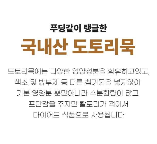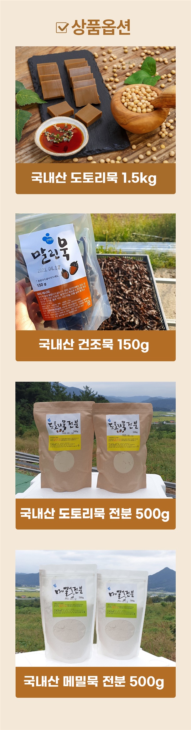 1. 포장단위별 용량(중량), 수량, 크기 | 국내산 도토리묵 1.5kg/ 국내산 건조묵 150g/ 국내산 도토리묵 전분 500g/ 국내산 메밀묵 전분 500g |