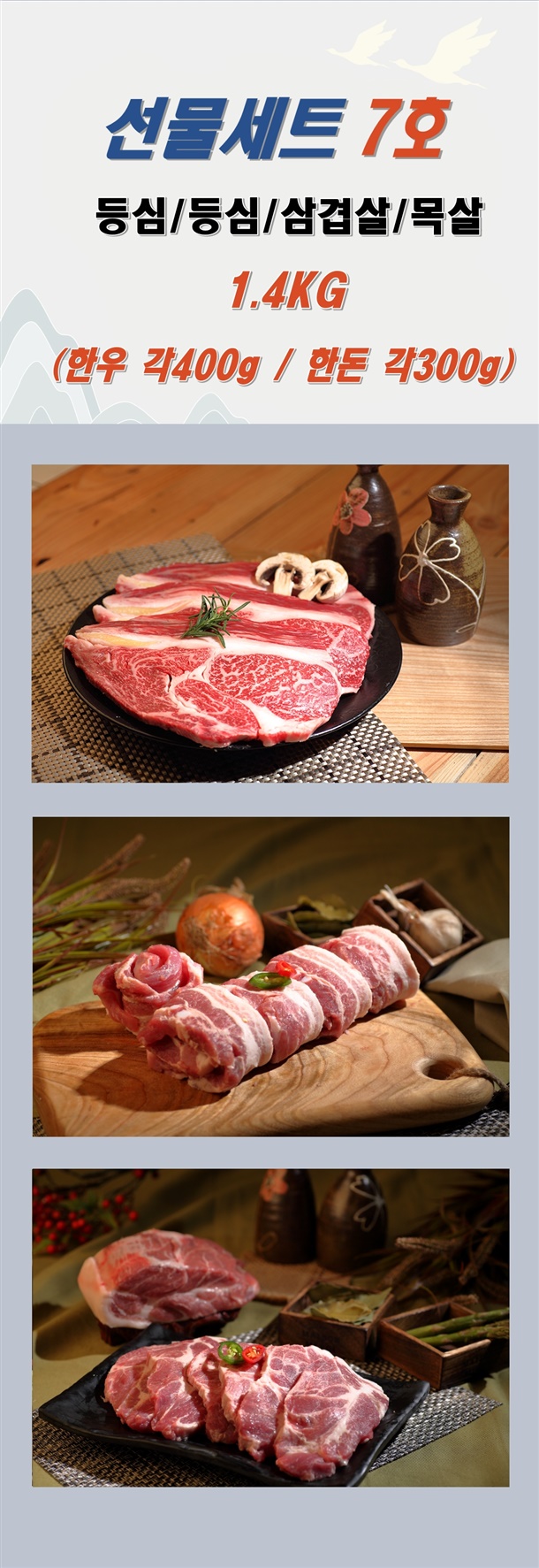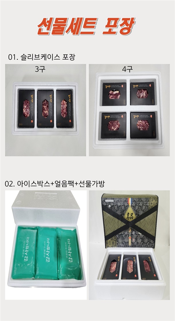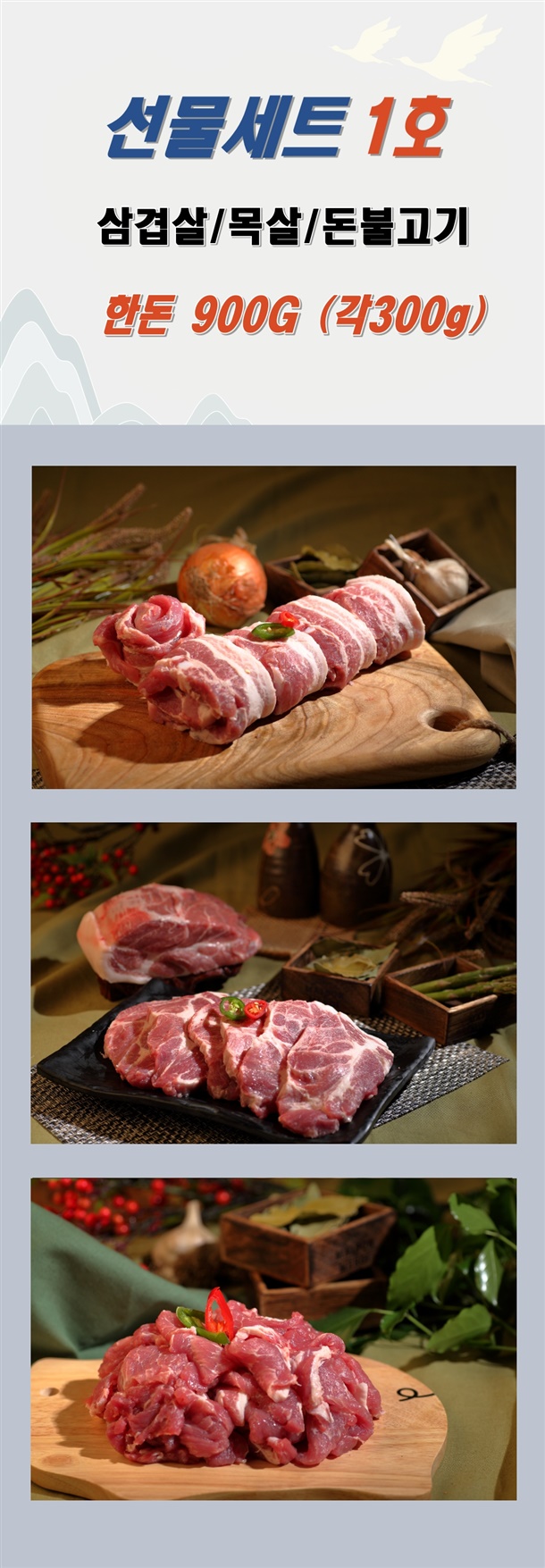 | 1. 포장단위별 용량(중량), 수량, 크기 | 한돈 3구 선물세트/돈삼겹살 300g + 돈목살 300g + 돈불고기 300g,한돈&한우 4구 선물세트/ 등심 400g + 등심 400g + 돈삼겹살 300g + 돈목살 300g |