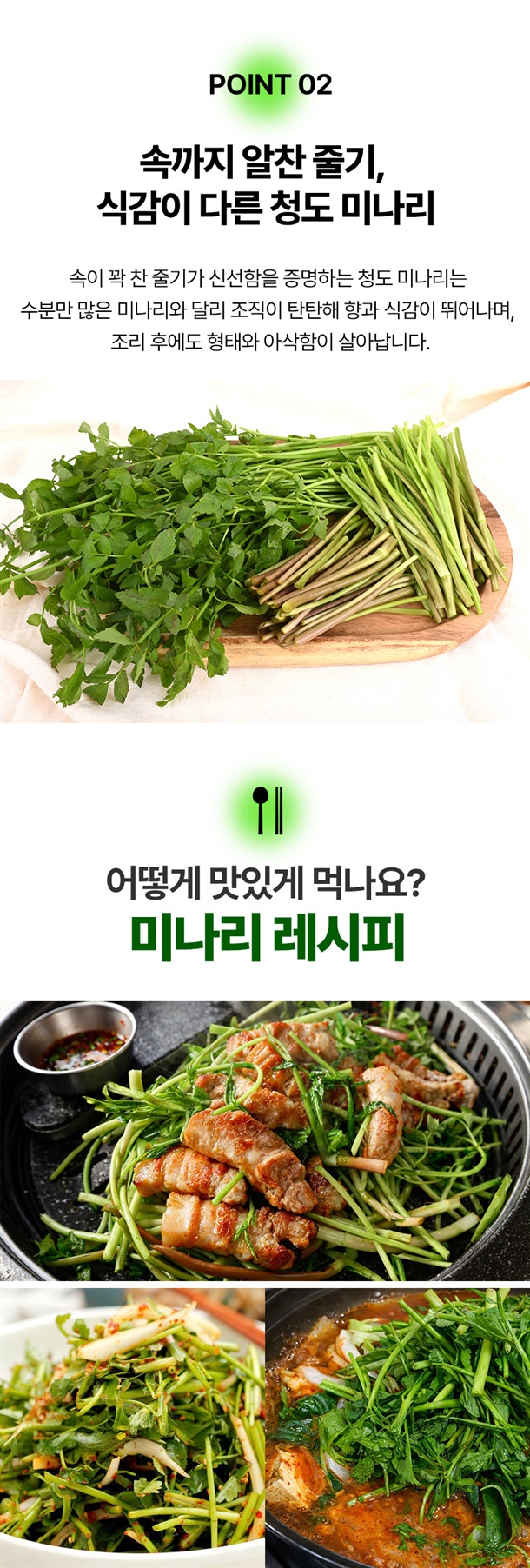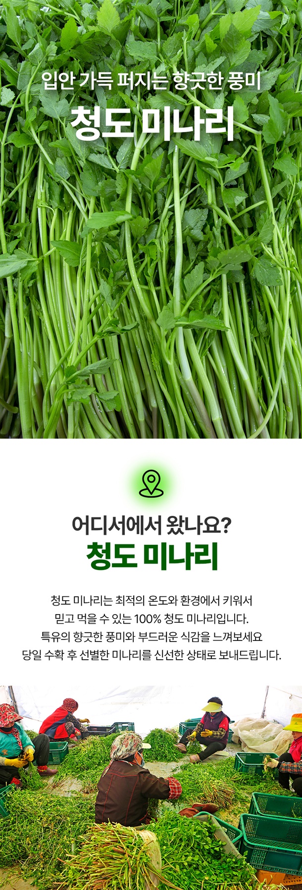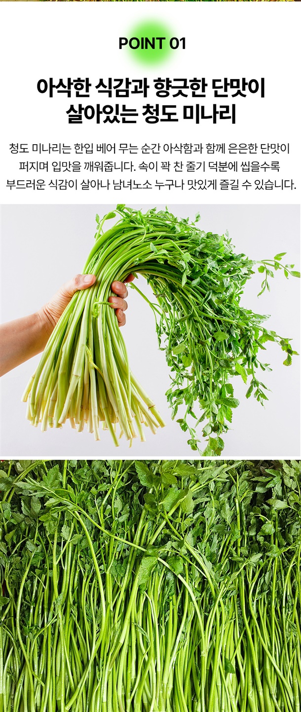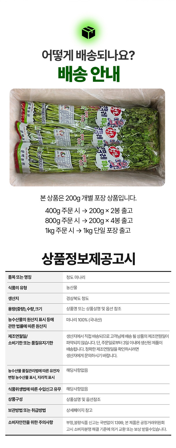 | 1. 포장단위별 용량(중량), 수량, 크기 | 청도 미나리 200g ,청도 미나리 400g,청도 미나리 800g |