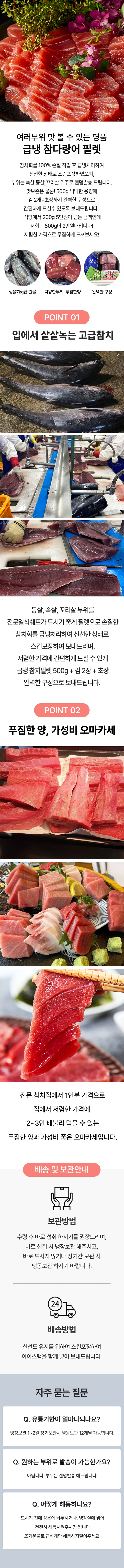 | 1. 포장단위별 용량(중량), 수량, 크기 | 동해안 생참치 필렛 500g + 서비스 초장 , 김 |