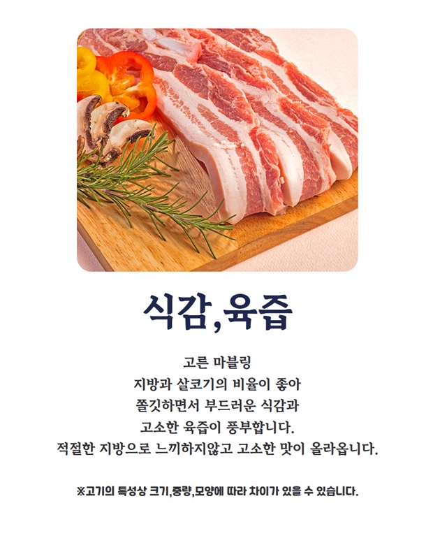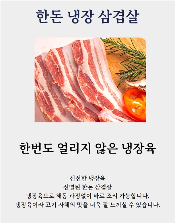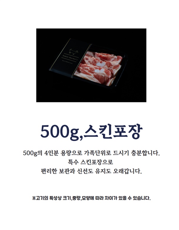 | 1. 포장단위별 용량(중량), 수량, 크기 | 국내산 냉장삼겹살 500g / 1팩 |