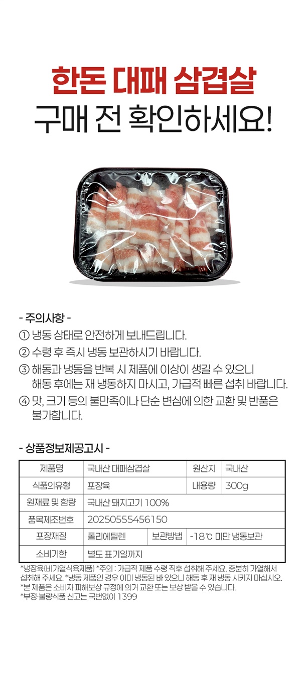 | 1. 포장단위별 용량(중량), 수량, 크기 | 국내산 한돈 대패삼겹살 300g |