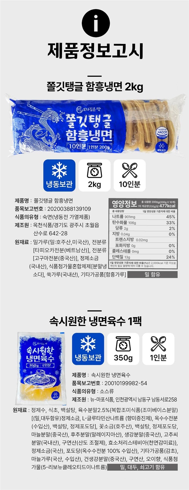1. 포장단위별 용량(중량), 수량, 크기 | 함흥 비빔냉면 10인분세트 , 함흥 물냉면 10인분세트 , 함흥 물냉면+비빔냉면 10인분 세트 |