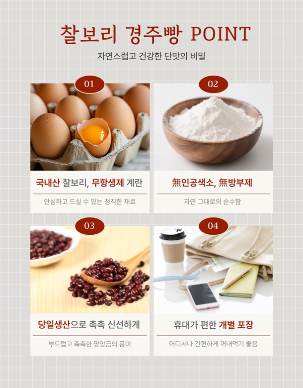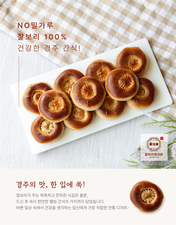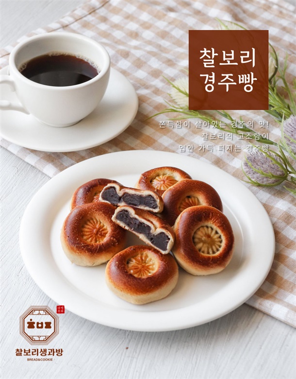 | 5. 원재료 및 함량 | 찰보리분말 12.7%(찰보리 100%국내산), 계란 3.49%(국내산), 통팥경주빵앙금 55% [팥(외국산-중국,캐나다,태국 등) 20.9%, 강낭콩(외국산-미국,캐나다,미얀마 등) 19.29%, 백설탕, 물엿, D-소비톨액, 재소금(호주산, 중국산)], 백설탕, 물엿, 연유, 탄산수소 나트륨 |