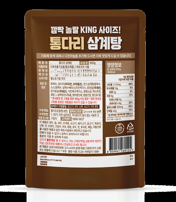 | 1. 포장단위별 용량(중량), 수량, 크기 | 닭다리살 통다리 삼계탕 600g /1팩 |