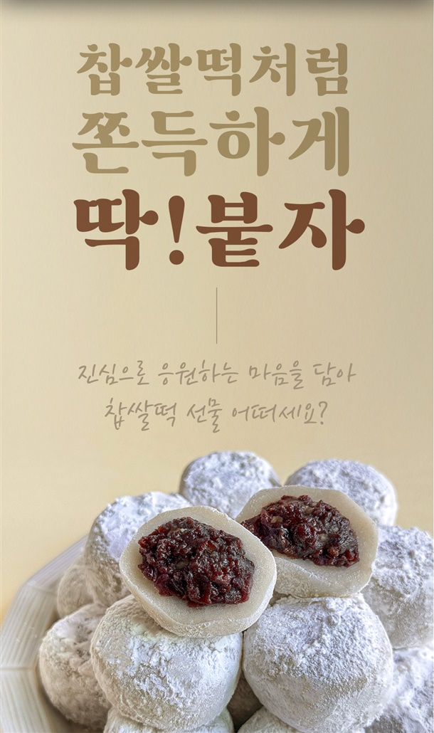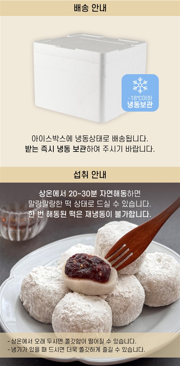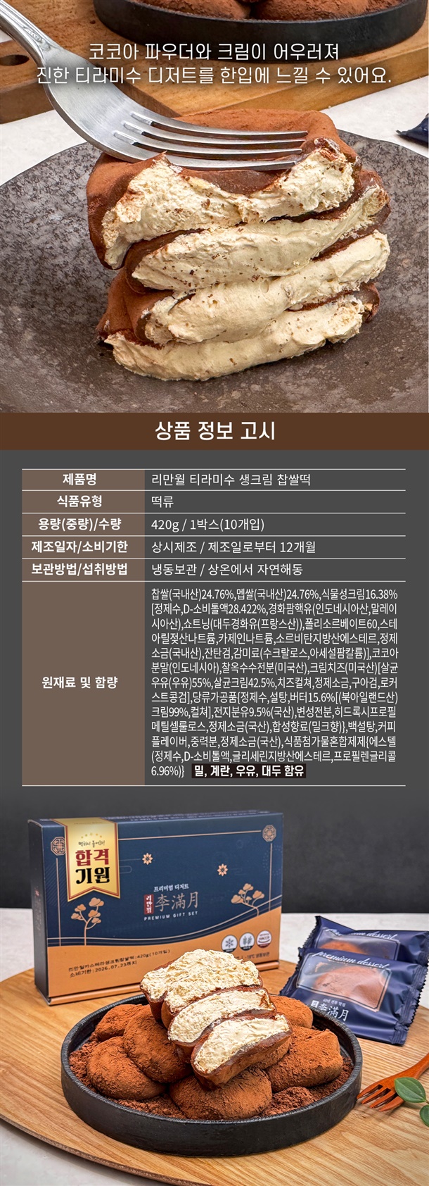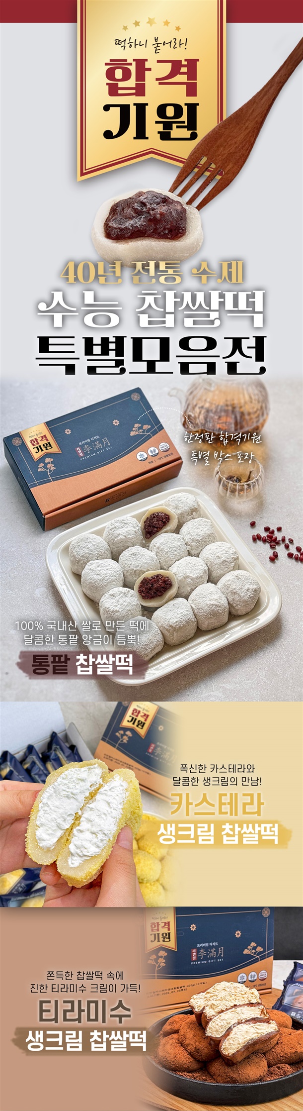 | 1. 포장단위별 용량(중량), 수량, 크기 | (수능)통팥 찹쌀떡750g(15개입) 1팩,(수능)카스테라생크림420g(10개) 1팩,(수능)티라미수생크림420g(10개) 1팩,(수능)찹쌀떡3총사(통팥1+카스테라1+티라미수1) |