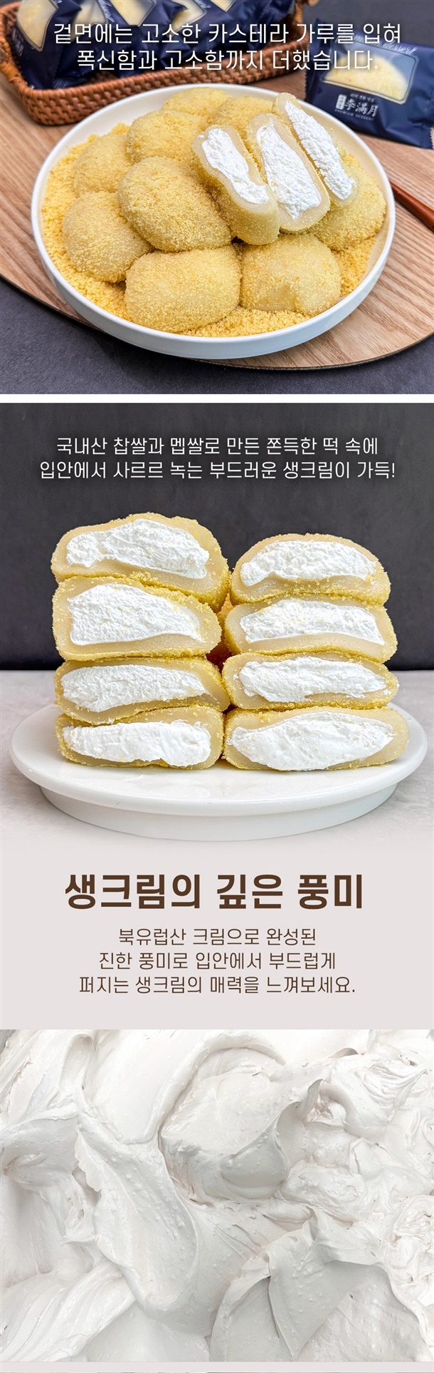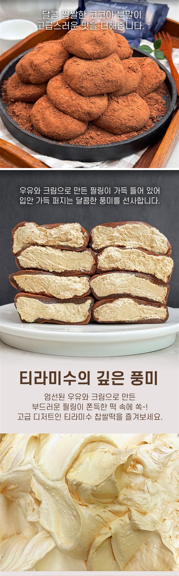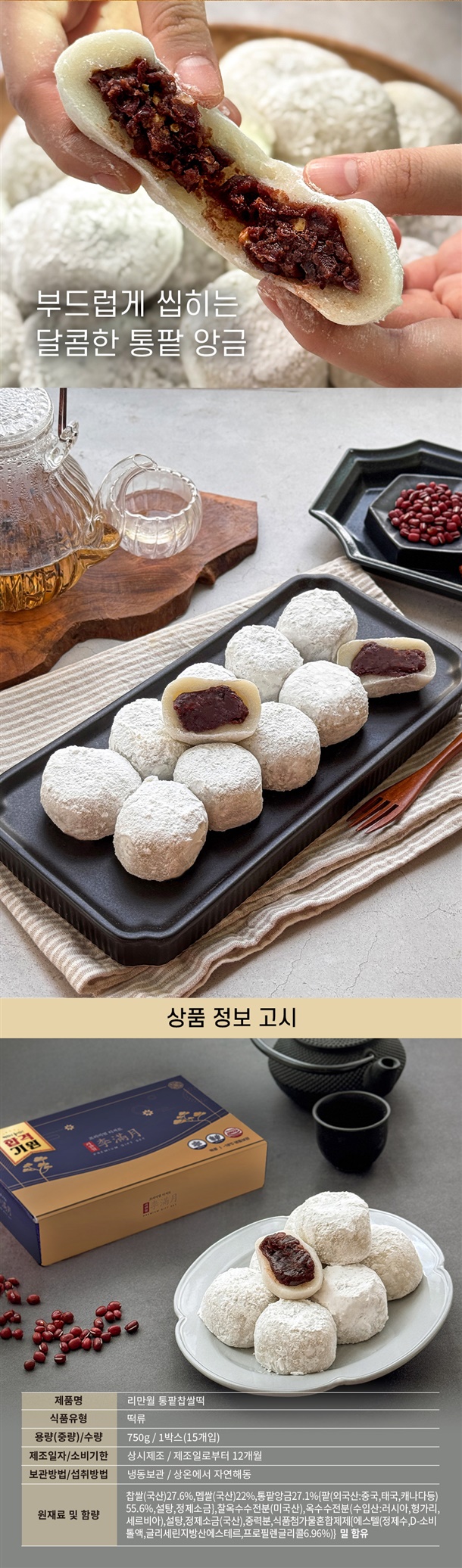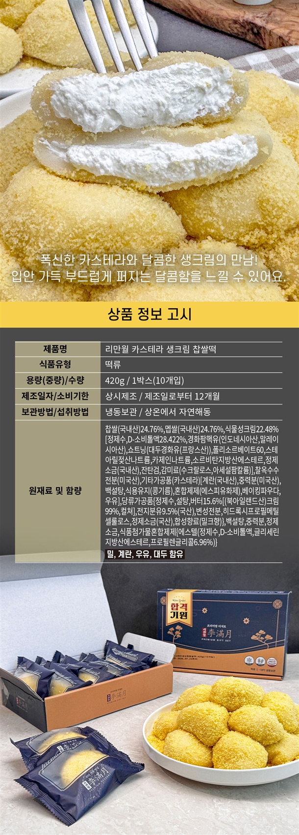 | 5. 원재료 및 함량 | *통팥 찹쌀떡 찹쌀(국산)27.6%,멥쌀(국산)22%,통팥앙금27.1%{팥(외국산:중국,태국,캐나다등)55.6%,설탕,정제소금},찰옥수수전분(미국산), 옥수수전분(수입산:러시아,헝가리,세르비아),설탕,정제소금(국산),중력분,식품첨가물혼합제제{에스텔(정제수,D-소비톨액,글리세린지방산에스테르,프로필렌글리콜6.96%)} 밀 함유 *카스테라 생크림 찹쌀(국내산)24.76%, 멥쌀(국내산)24.76%, 식물성크림22.48%[정제수, D-소비톨액28.422%, 경화팜핵유(인도네시아산, 말레이시아산), 쇼트닝(대두경화유(프랑스산)), 폴리소르베이트60, 스테아릴젓산나트륨, 카제인나트륨, 소르비탄지방산에스테르, 정제소금(국내산), 잔탄검, 감미료(수크랄로스, 아세설팜칼륨)], 찰옥수수전분(미국산), 기타가공품(카스텔라)[계란(국내산), 중력분(미국산), 백설탕, 식용유지(콩기름), 혼합제제(에스피유화제), 베이킹파우다, 우유], 당류가공품{정제수, 설탕, 버터15.6[(북아일랜드산)크림99%, 컬쳐], 전지분유9.5%(국산), 변성전분, 히드록시프로필메틸셀룰로스, 정제소금(국산), 합성향료(밀크향)}, 백설탕, 중력분, 정제소금, 식품첨가물혼합제제{에스텔(정제수, D-소비톨액, 글리세린지방산에스테르, 프로필렌글리콜6.96%)} * 티라미수 생크림 찹쌀(국내산)24.76%, 멥쌀(국내산)24.76%, 식물성크림16.38%[정제수, D-소비톨액28.422%, 경화팜핵유(인도네시아산, 말레이시아산), 쇼트닝(대두경화유(프랑스산)), 폴리소르베이트60, 스테아릴젓산나트륨, 카제인나트륨, 소르비탄지방산에스테르, 정제소금(국내산), 잔탄검, 감미료(수크랄로스, 아세설팜칼륨)], 코코아분말(인도네시아), 찰옥수수전분(미국산), 크림치즈(미국산)[살균우유(우유)55%, 살균크림42.5%, 치즈컬쳐, 정제소금, 구아검, 로커스트콩검], 당류가공품{정제수, 설탕, 버터15.6[(북아일랜드산)크림99%, 컬쳐], 전지분유9.5%(국산), 변성전분, 히드록시프로필메틸셀룰로스, 정제소금(국산), 합성향료(밀크향)}, 백설탕, 커피플레이버, 중력분, 정제소금(국산), 식품첨가물혼합제제{에스텔(정제수, D-소비톨액, 글리세린지방산에스테르, 프로필렌글리콜6.96%)} |