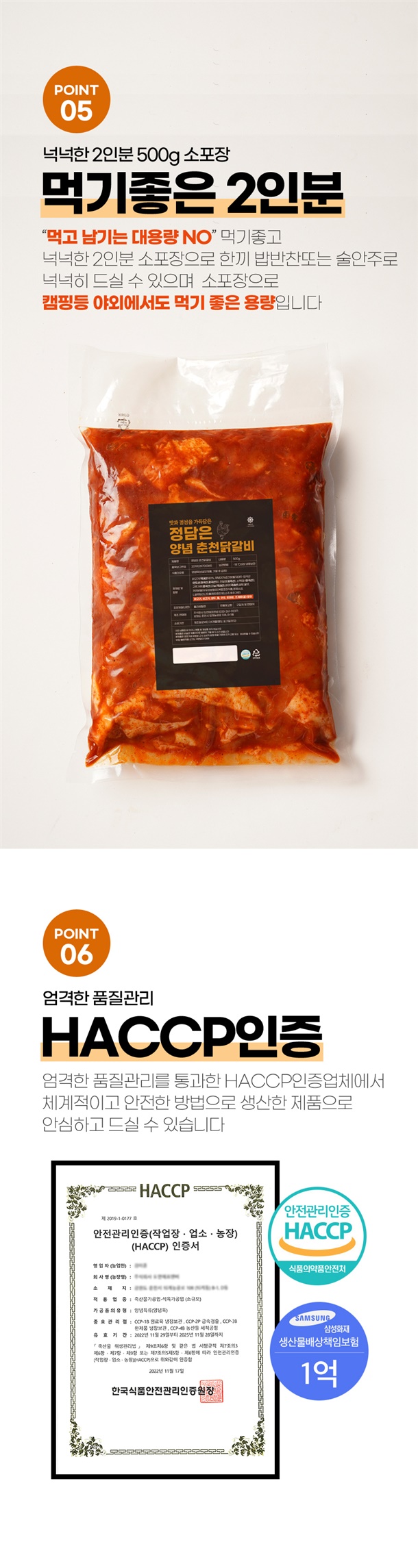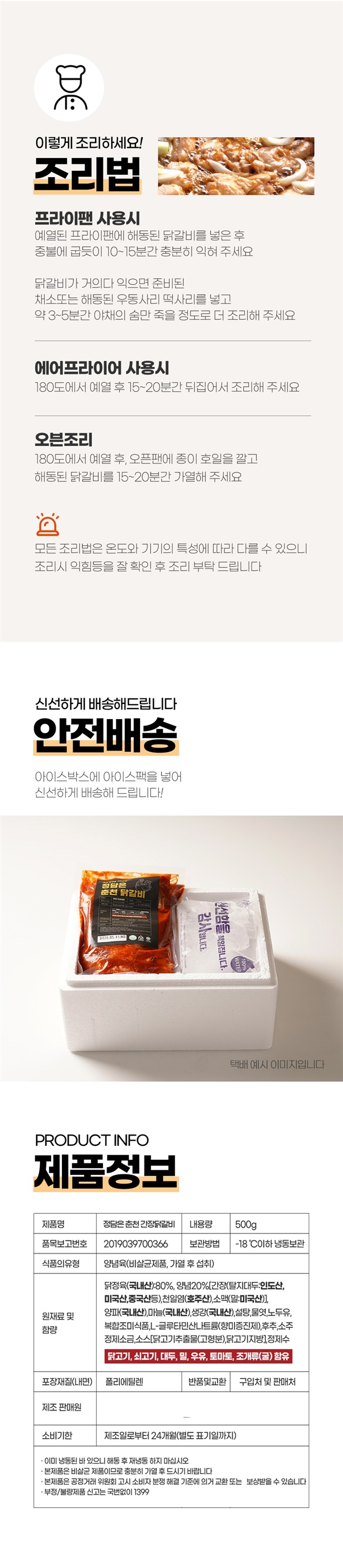 | 1. 포장단위별 용량(중량), 수량, 크기 | 춘천닭갈비 간장500g,양념 500g |
