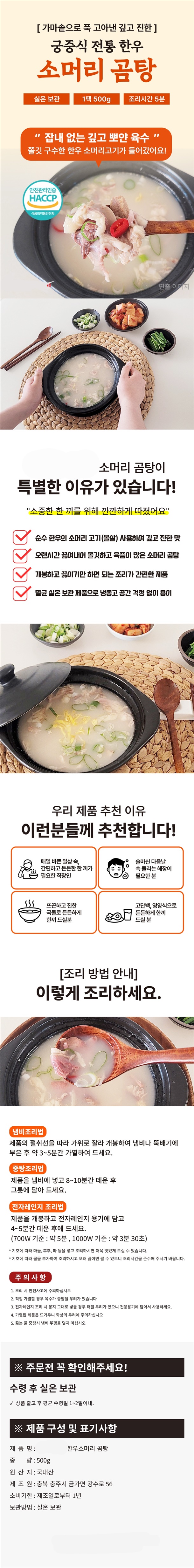 | 1. 포장단위별 용량(중량), 수량, 크기 | 한우 소머리곰탕 500g 3개,한우 소머리곰탕 500g 5개 |