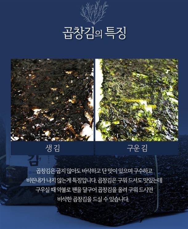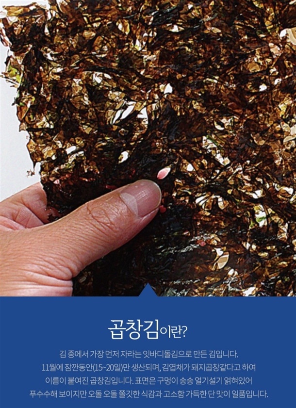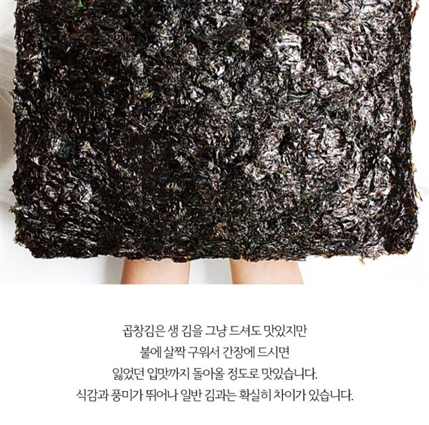 | 1. 포장단위별 용량(중량), 수량, 크기 | 곱창김 100매 / 350g 내외 |