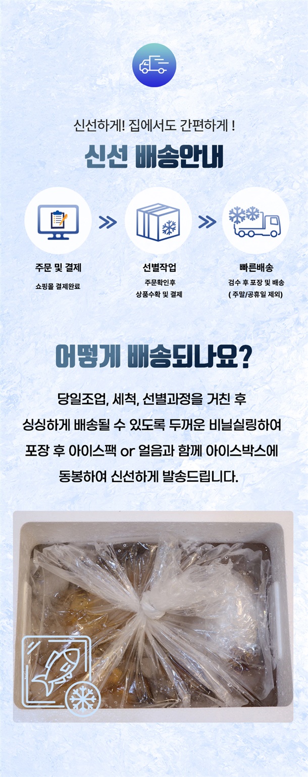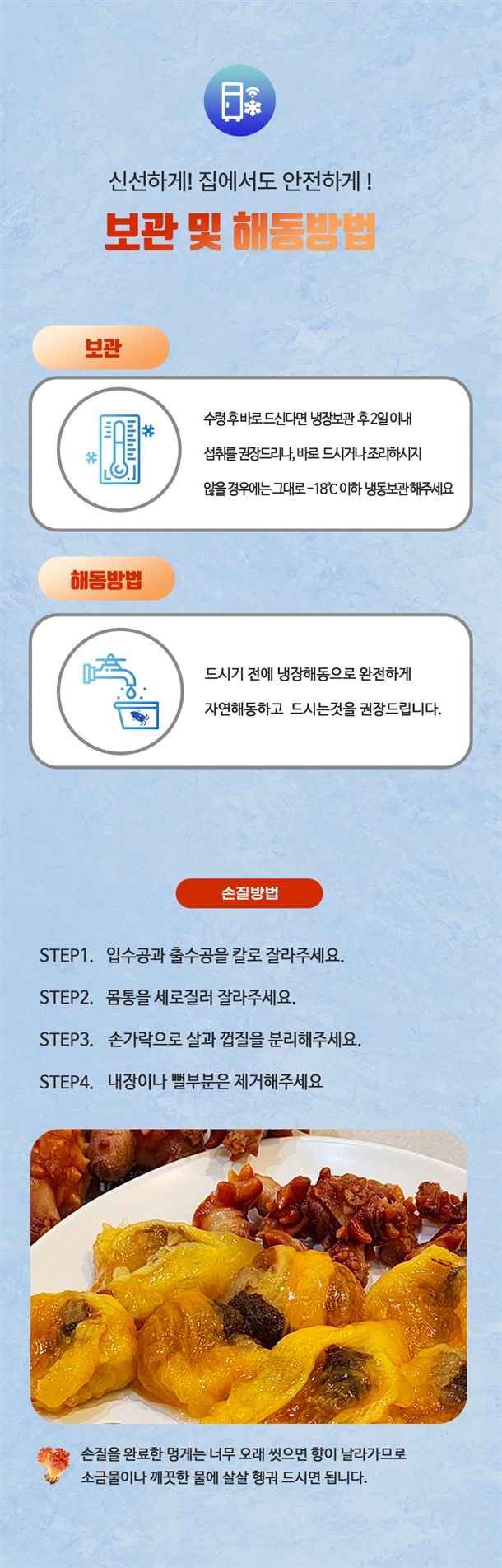 | 6. 보관방법 또는 취급방법 | 당일 냉장 외 손질 후 냉동보관 |
